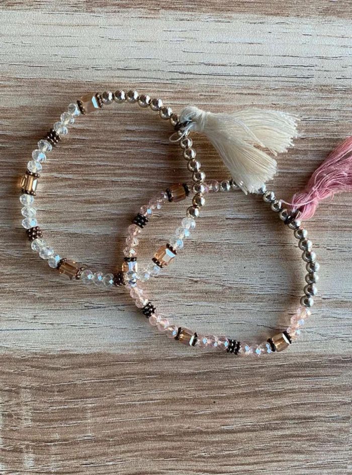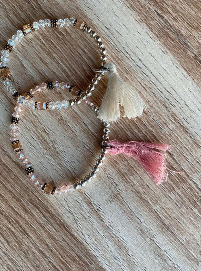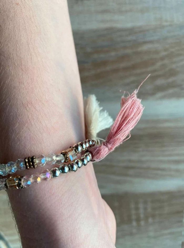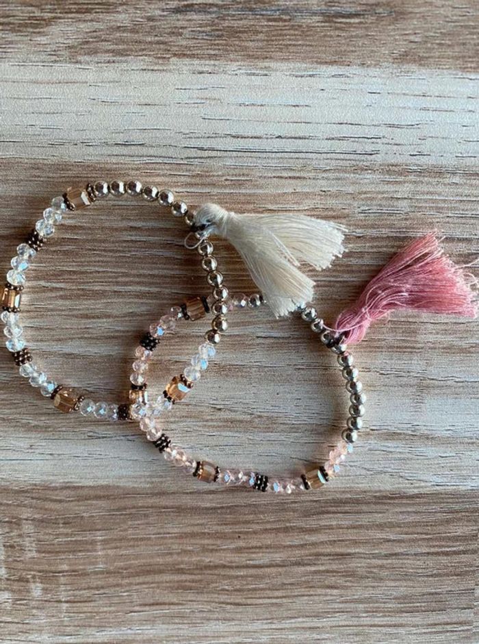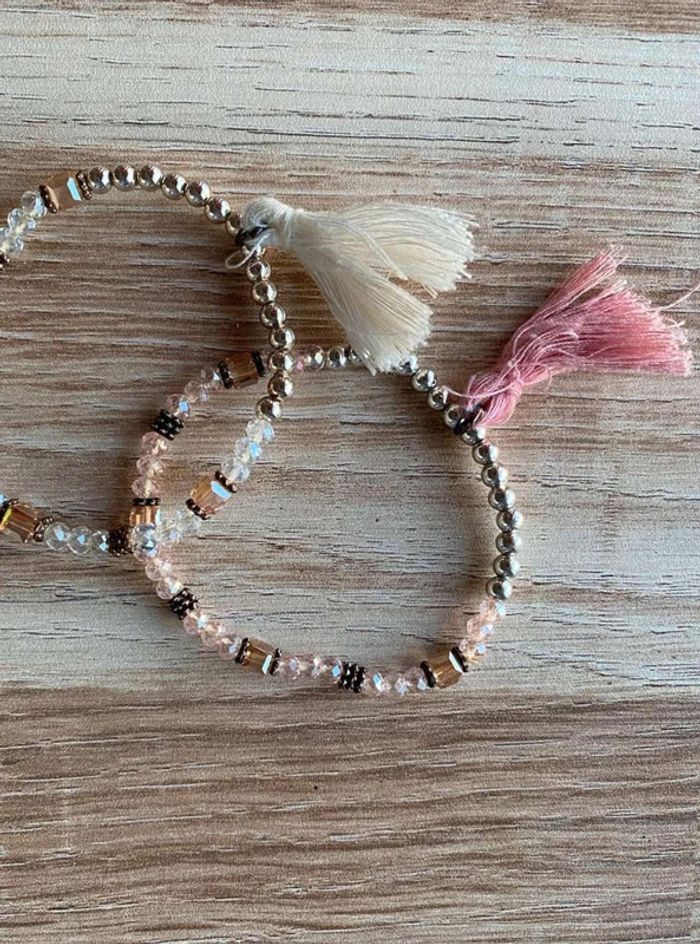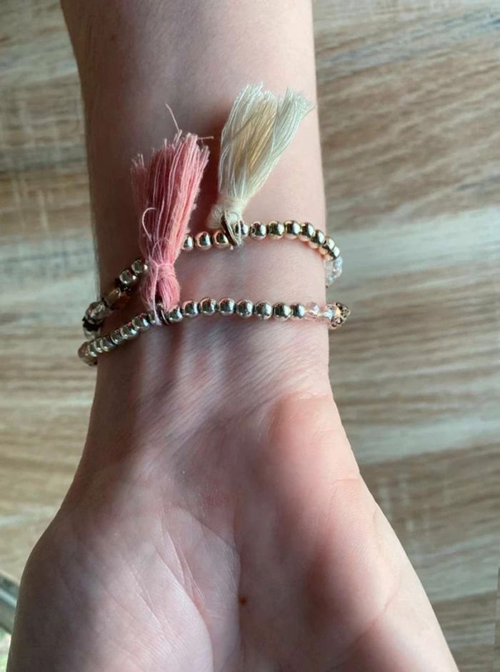 Bracelet perles fantaisies x2 Lot de 2 bracelets Un bracelet couleur blanche + pompon blanc Un bracelet couleur rose + pompon rose Doré Bon état Acheté dans une boutique de bijoux à St Tropez