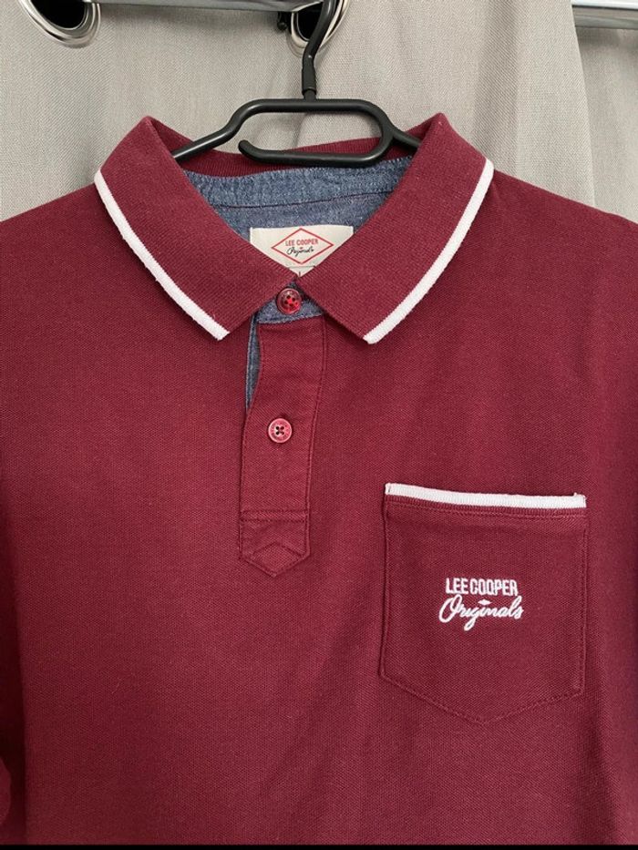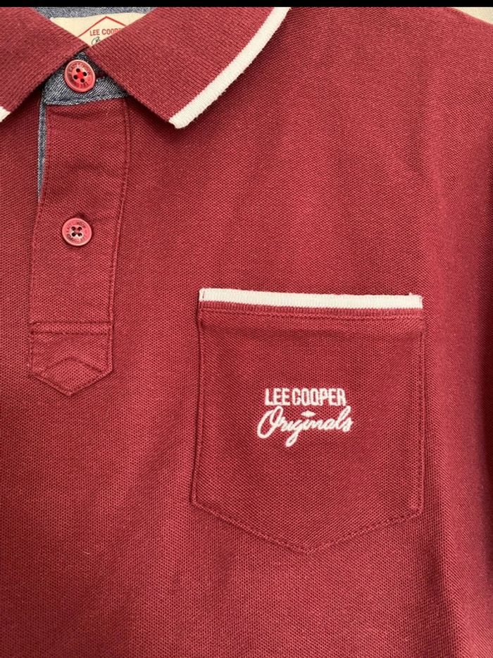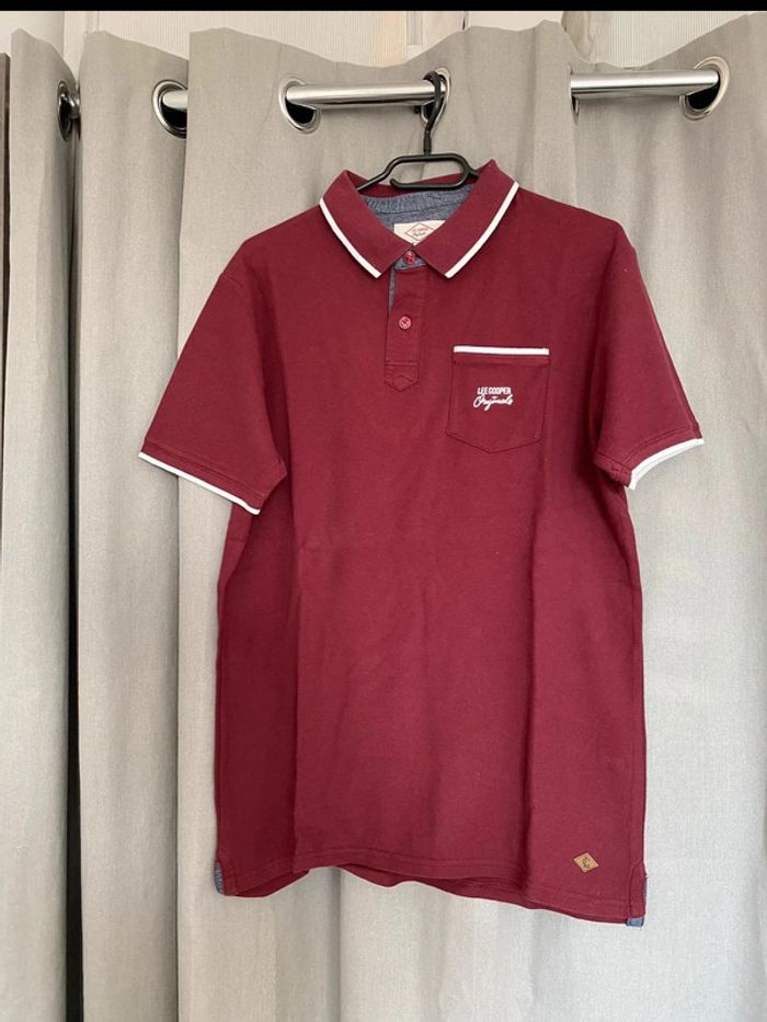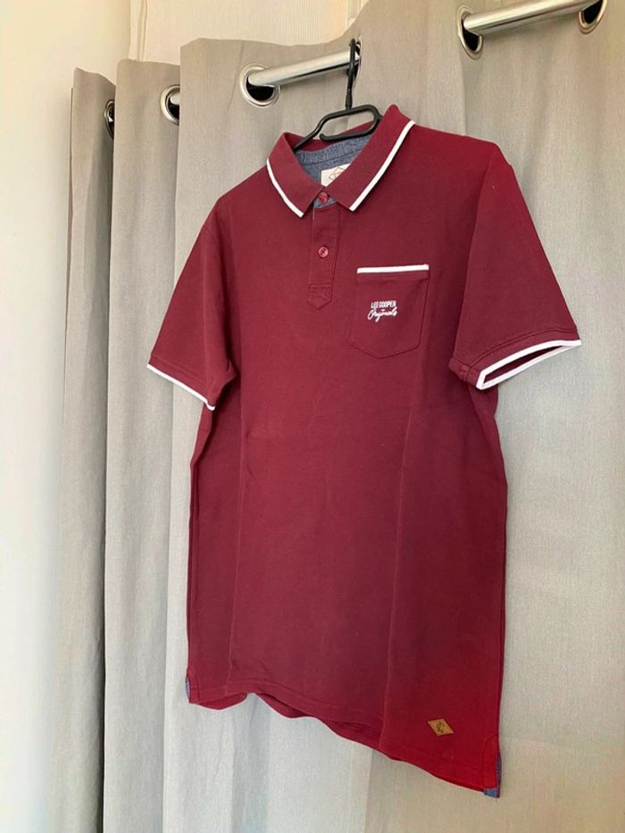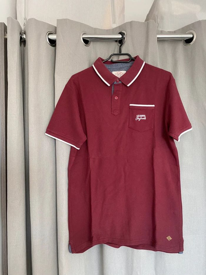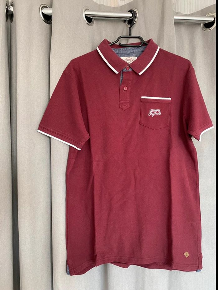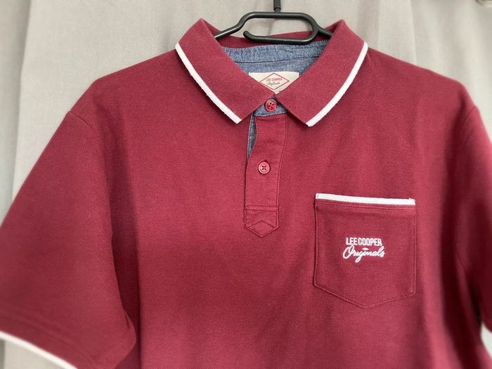 Polo Polo manches courtes bordeaux et blanc avec une poche devant et écriture blanche « Lee Cooper » Petit logo en bas à droite Jamais porté mais petite trace noir derrière (voir photos) 100% coton Taille L Très bon état, Jamais porté 13€