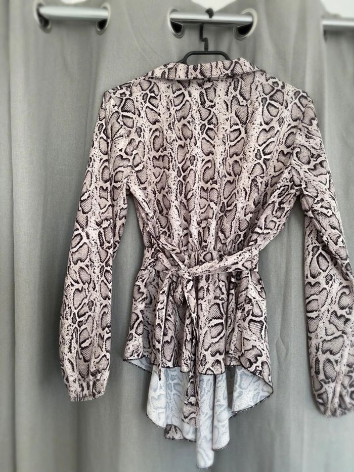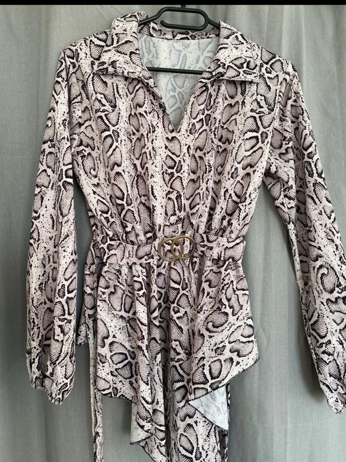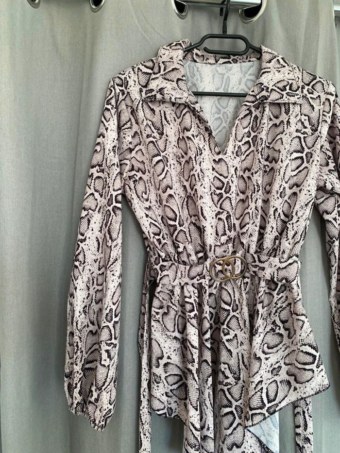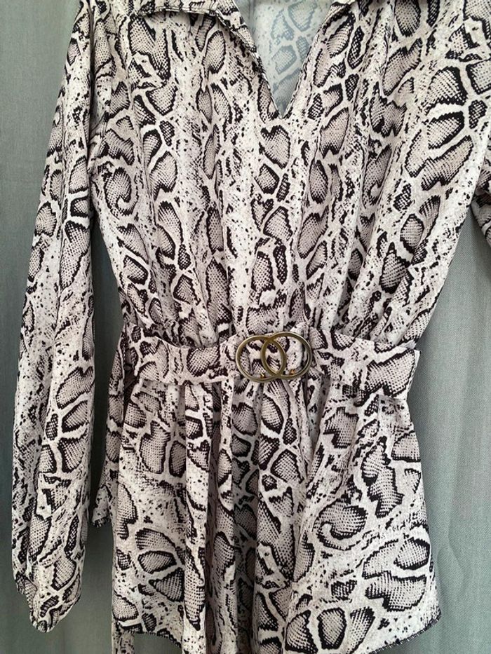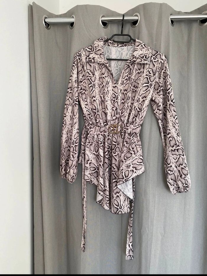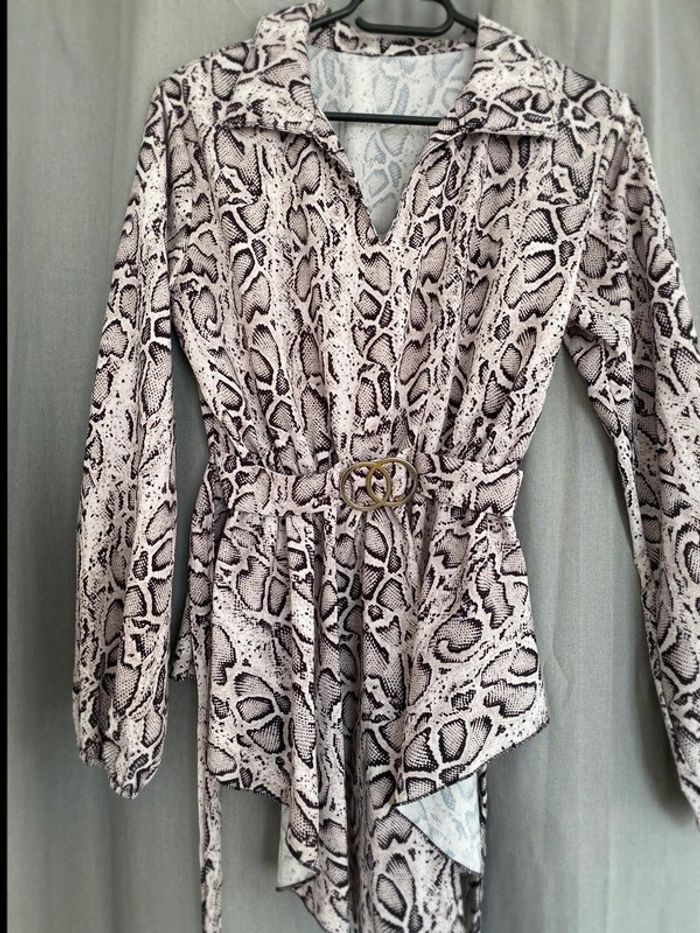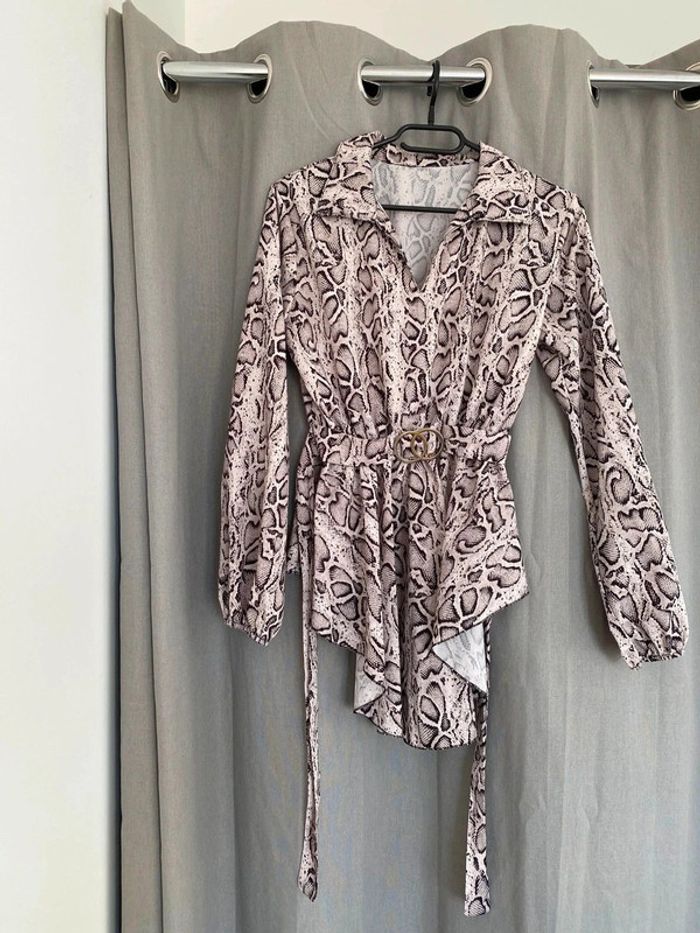 Tunique/ motifs animal Tunique motif serpent beige/ noir/ gris, taupe Plus longue sur le devant et plus courte derriere Avec ceinture doré double boucle/ ceinture sur le devant et noeud à l’arrière / reserrée aussi au niveau de l’arrière / décolleté devant et col Bien regarder les photos Très bon état Plutôt fluide, à volants sur le devant Acheté dans une boutique/ sans étiquette S/M je pense 15€