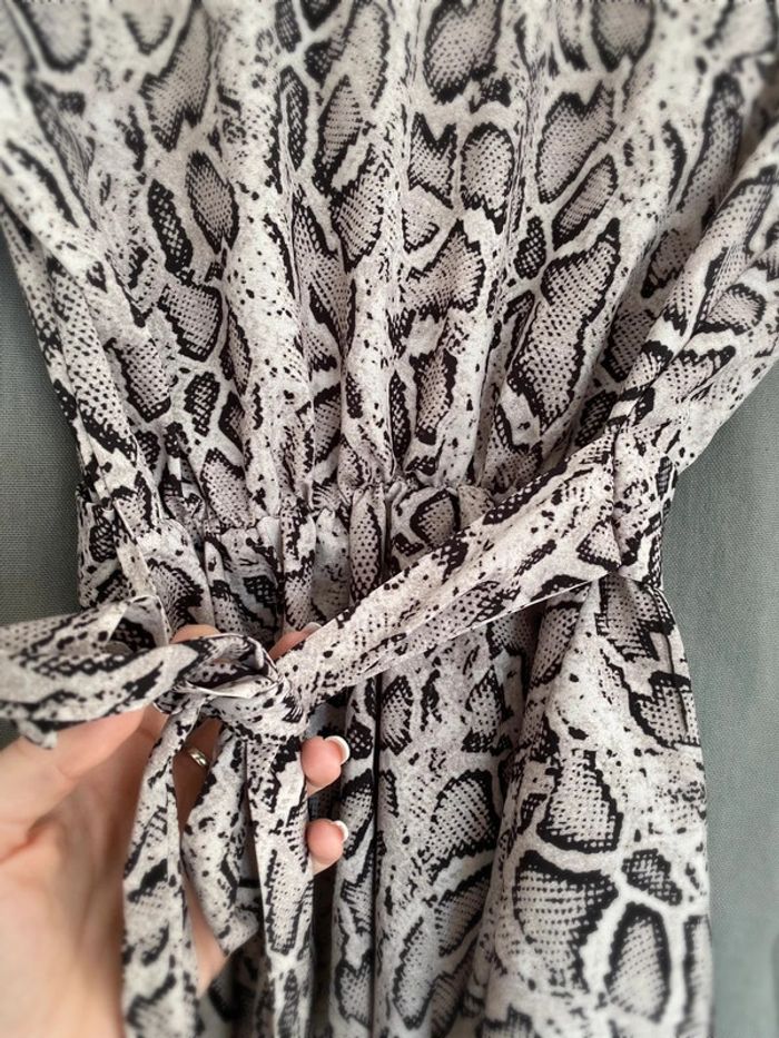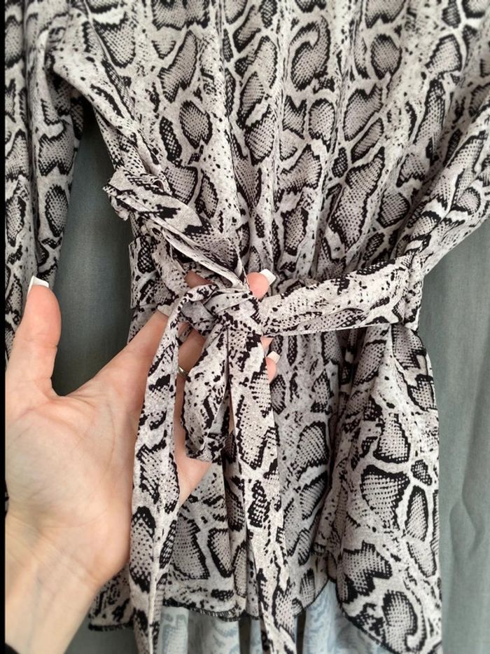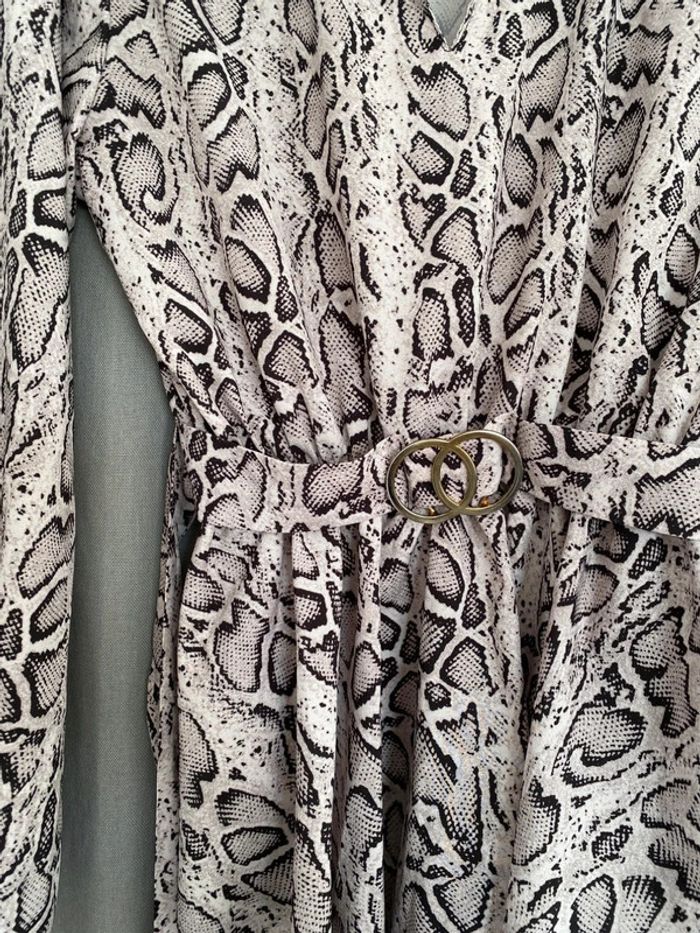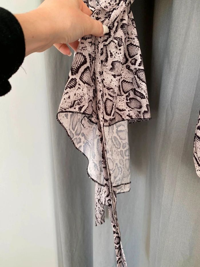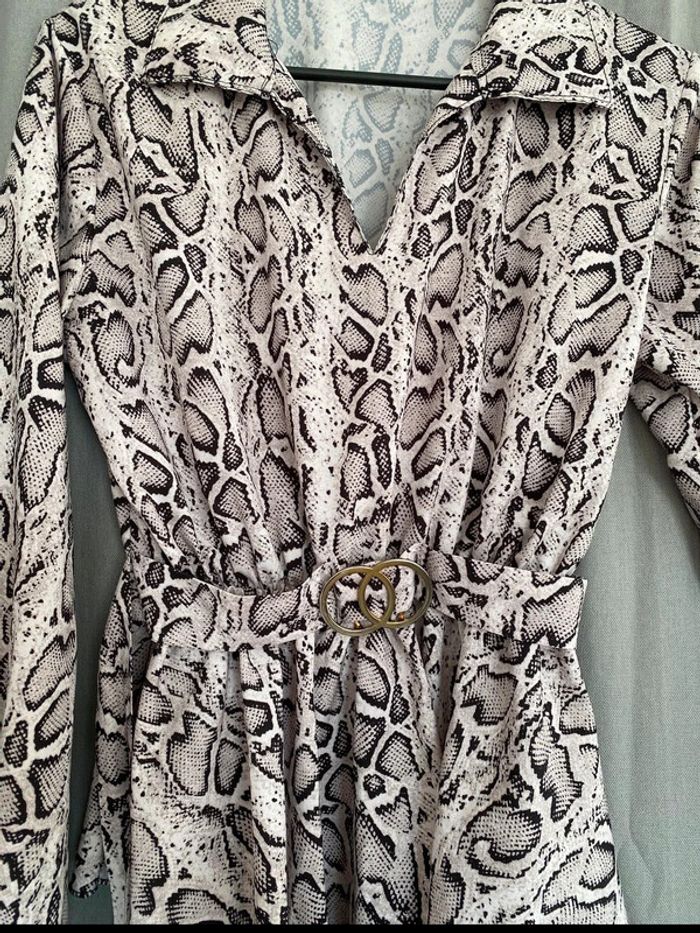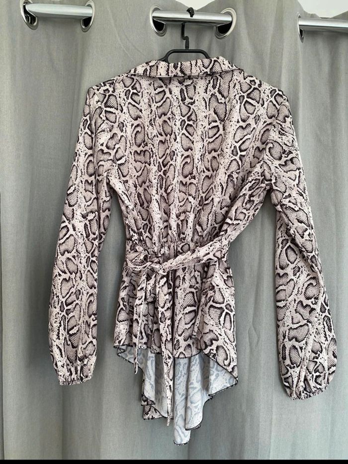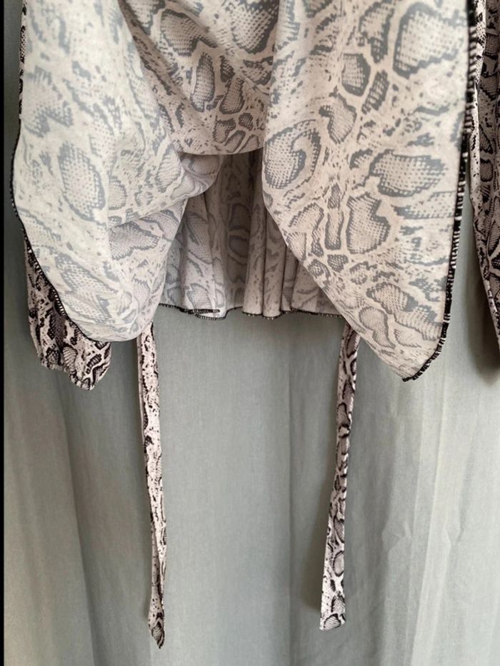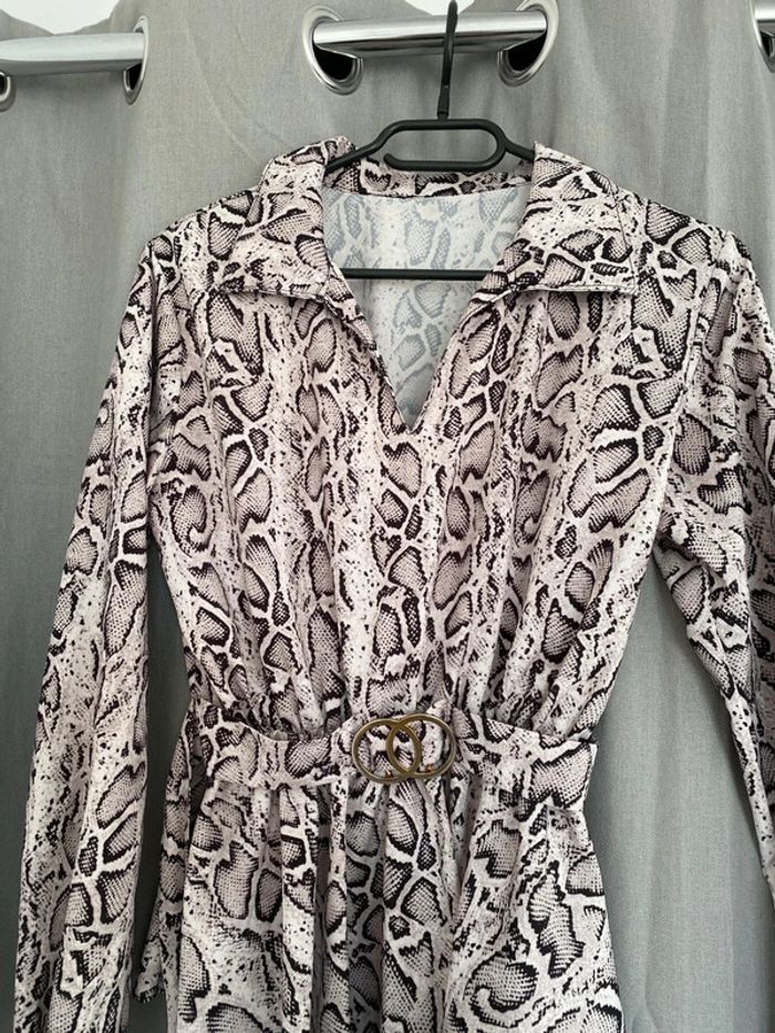 Tunique/ motifs animal Tunique motif serpent beige/ noir/ gris, taupe Plus longue sur le devant et plus courte derriere Avec ceinture doré double boucle/ ceinture sur le devant et noeud à l’arrière / reserrée aussi au niveau de l’arrière / décolleté devant et col Bien regarder les photos Très bon état Plutôt fluide, à volants sur le devant Acheté dans une boutique/ sans étiquette S/M je pense 15€