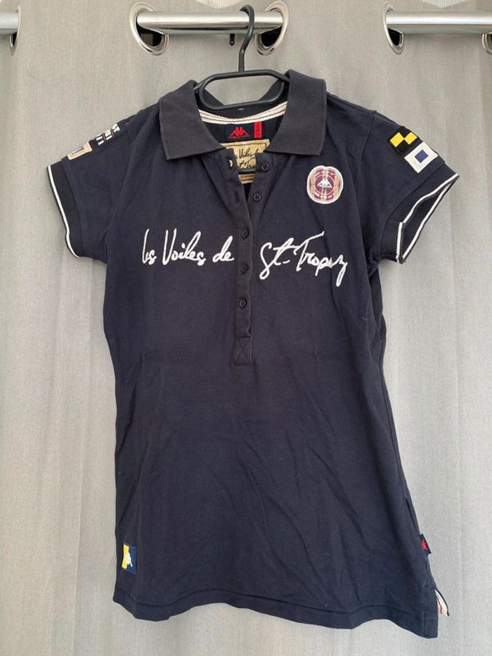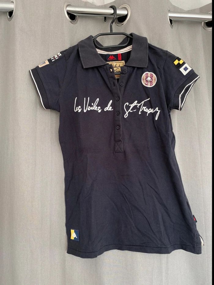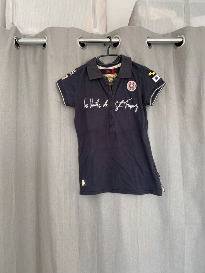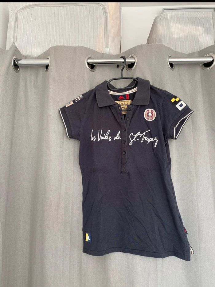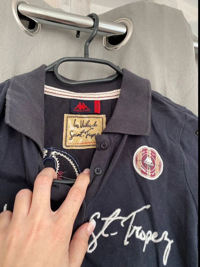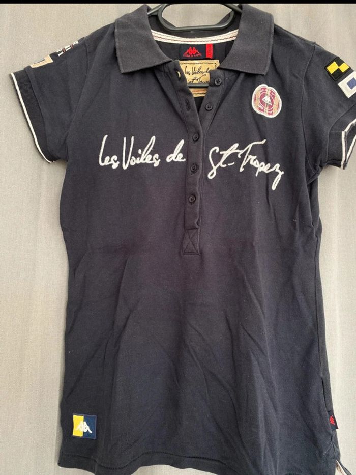Polo Polo bleu marine Les Voiles de St Tropez Écriture + logo sur le devant Logo sur les deux manches Polo manches courtes Logo en bas du tee shirt également Chiffre 30 à l’arrière Bon état ⚠️mais tache blanc derrière en dessous du logo (voir photos) Taille XS Marque Kappa 8€