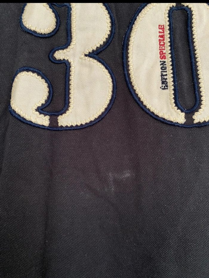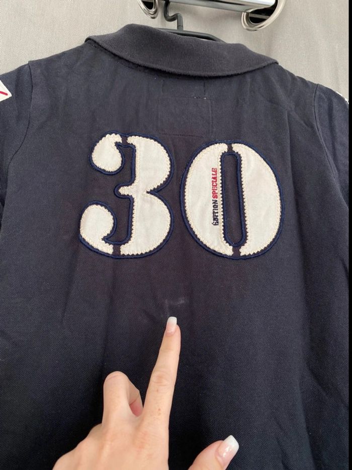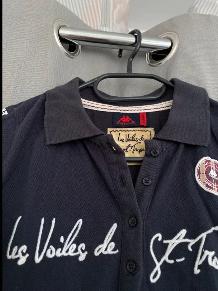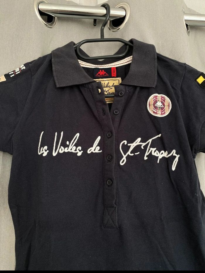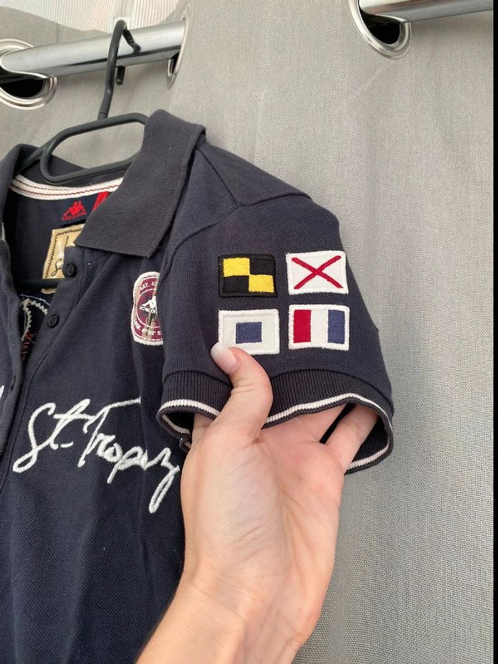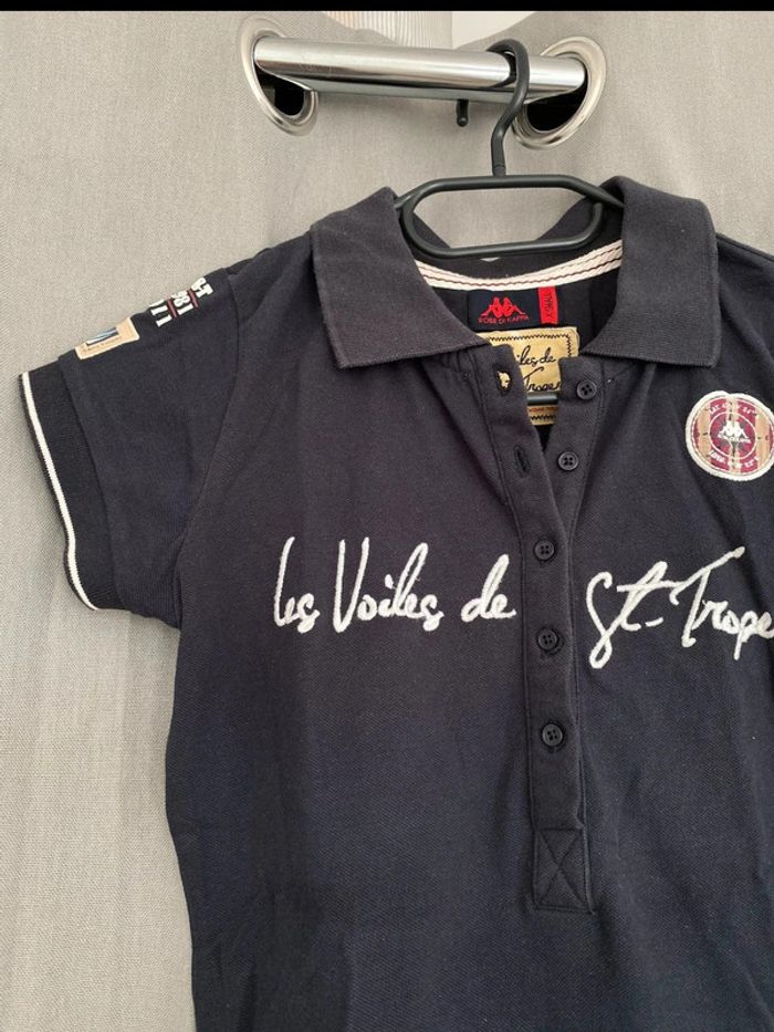 Polo Polo bleu marine Les Voiles de St Tropez Écriture + logo sur le devant Logo sur les deux manches Polo manches courtes Logo en bas du tee shirt également Chiffre 30 à l’arrière Bon état ⚠️mais tache blanc derrière en dessous du logo (voir photos) Taille XS Marque Kappa 8€