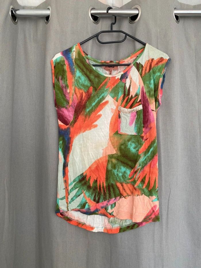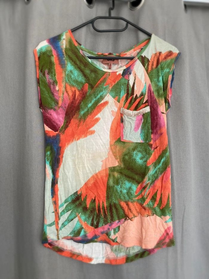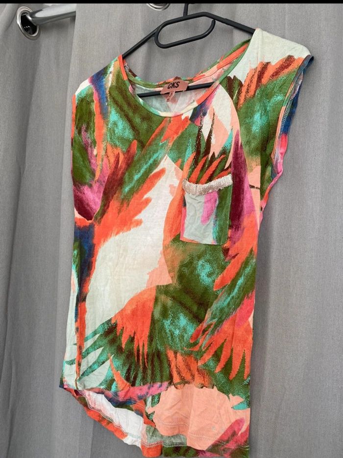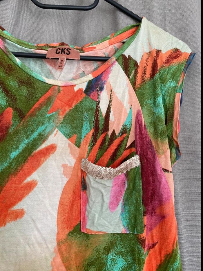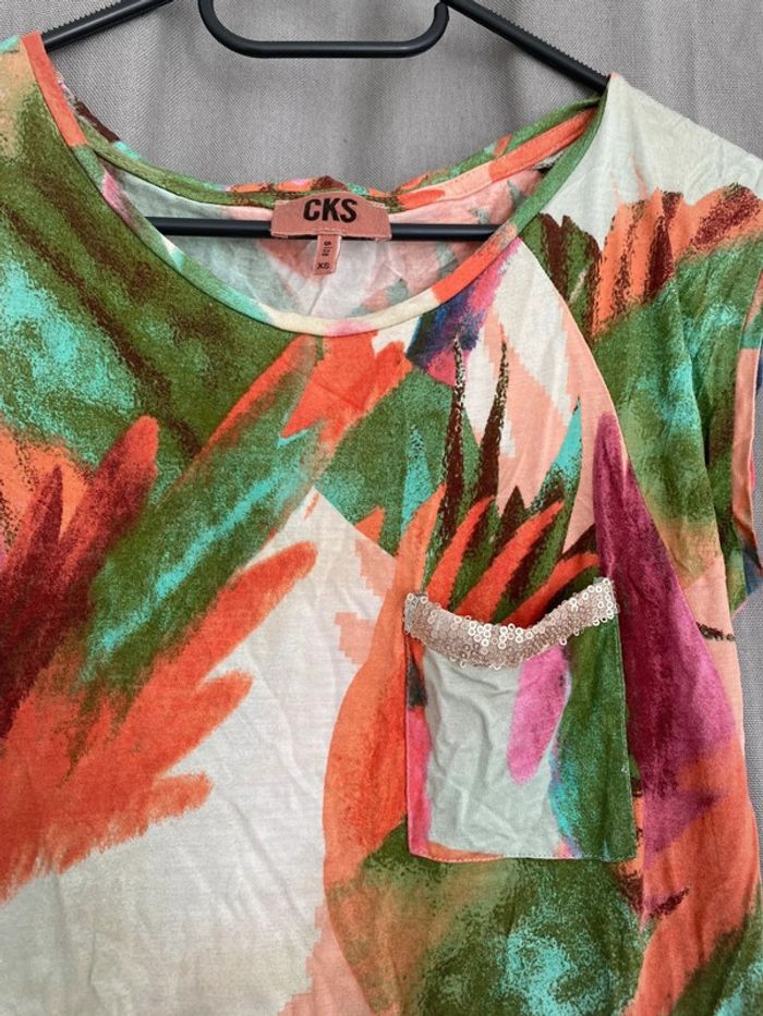 Haut été Haut été à motifs/ motifs floraux Poche sur le devant avec strass Bon état, mais quelques petits trous en bas du haut (voir photos) Marque CKS Taille XS 7€