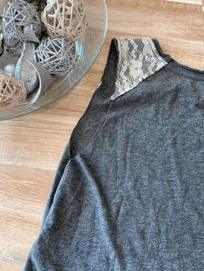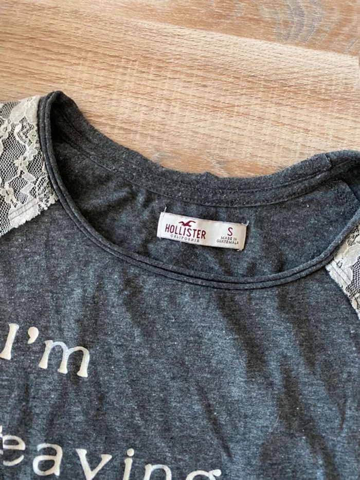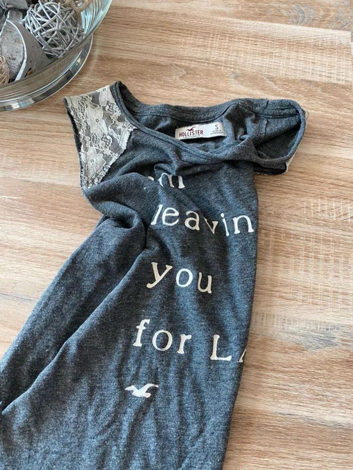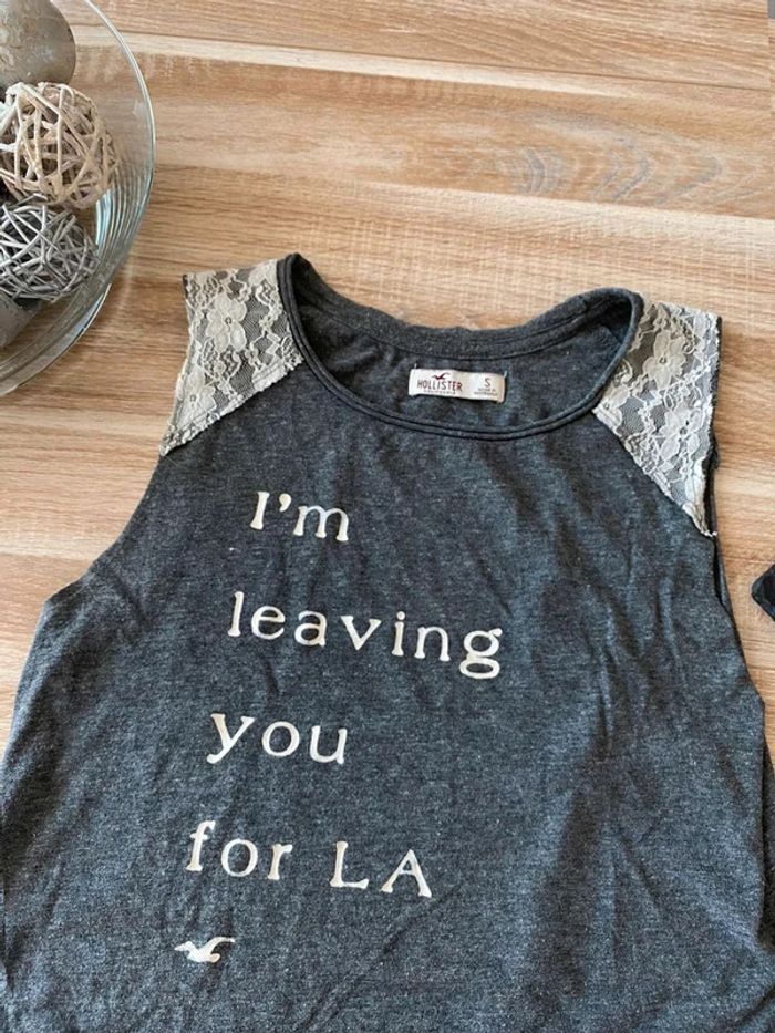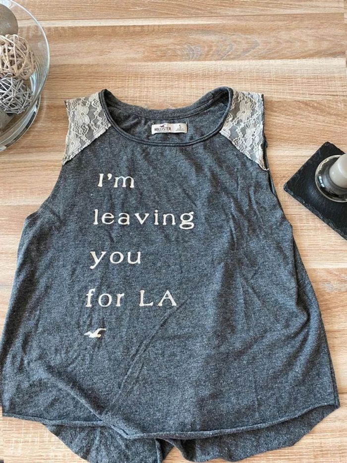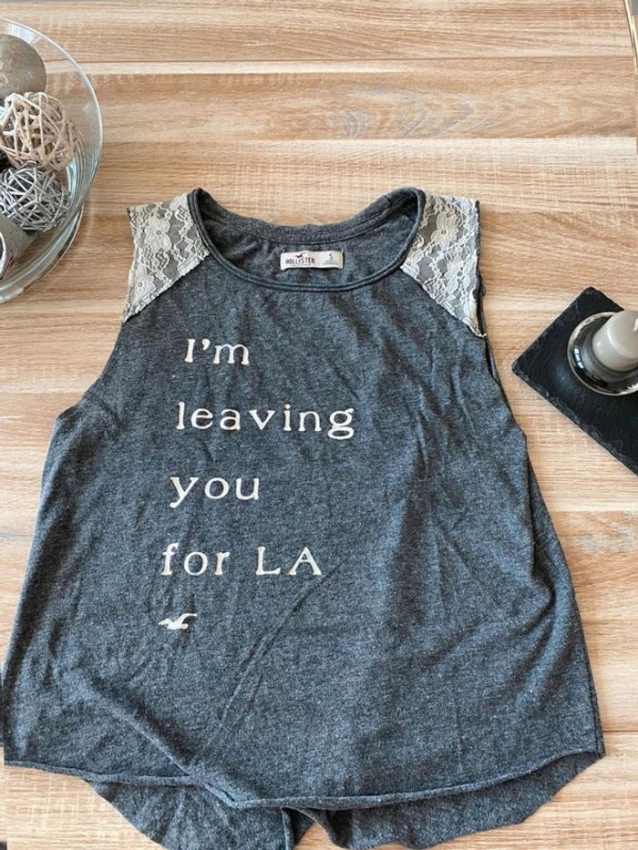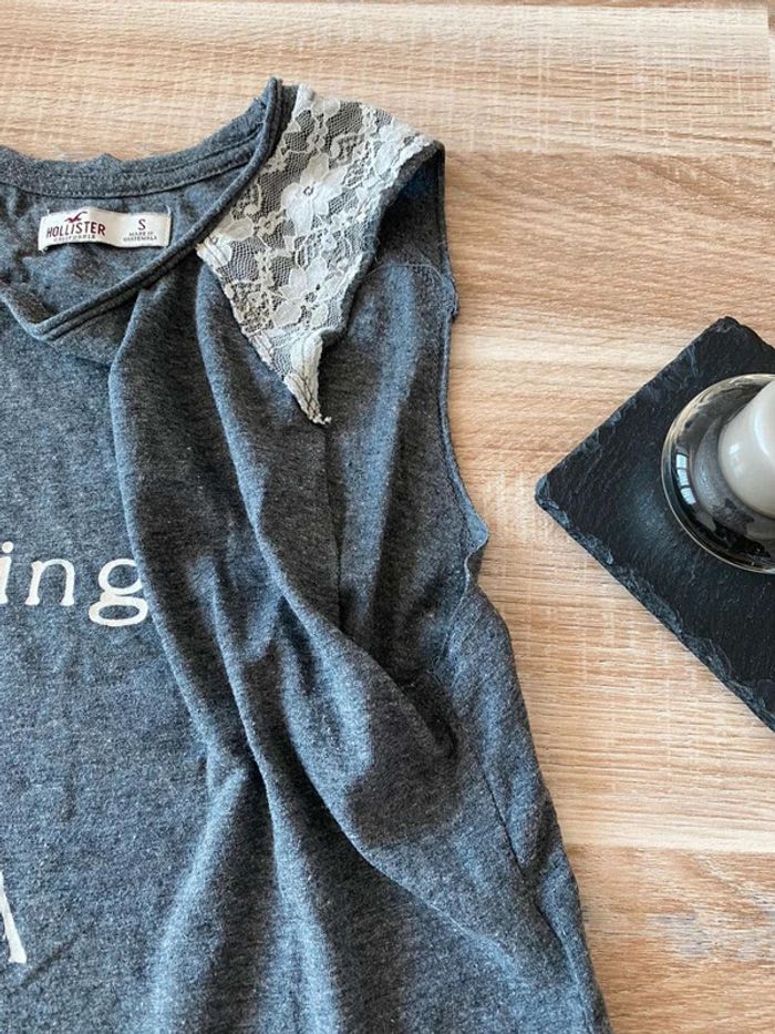 Débardeur gris Hollister Taille S Très bon état Ouvert sur les côtes - Sans manches Dentelle blanche sur le dessus des épaules, écriture blanches + signe mouette devant. Uni gris à l’arrière Me demander plus de photos si intéressé😊