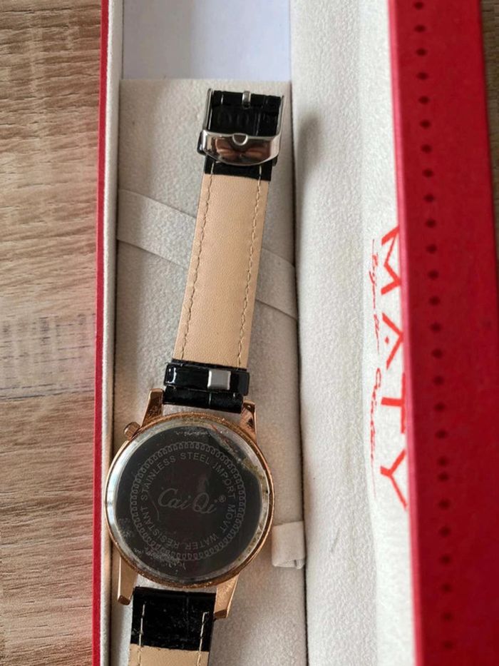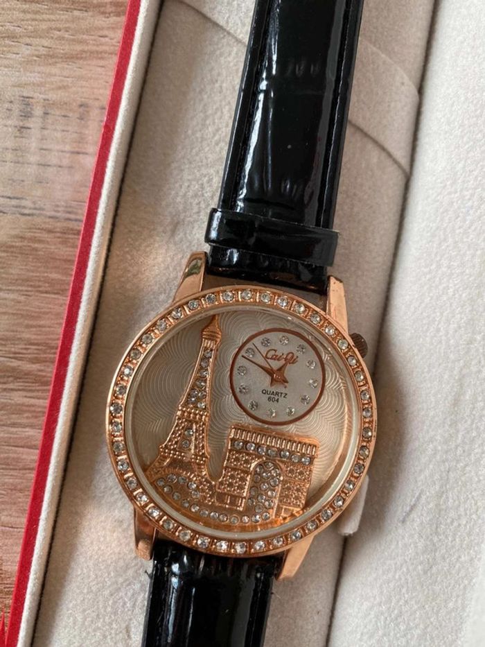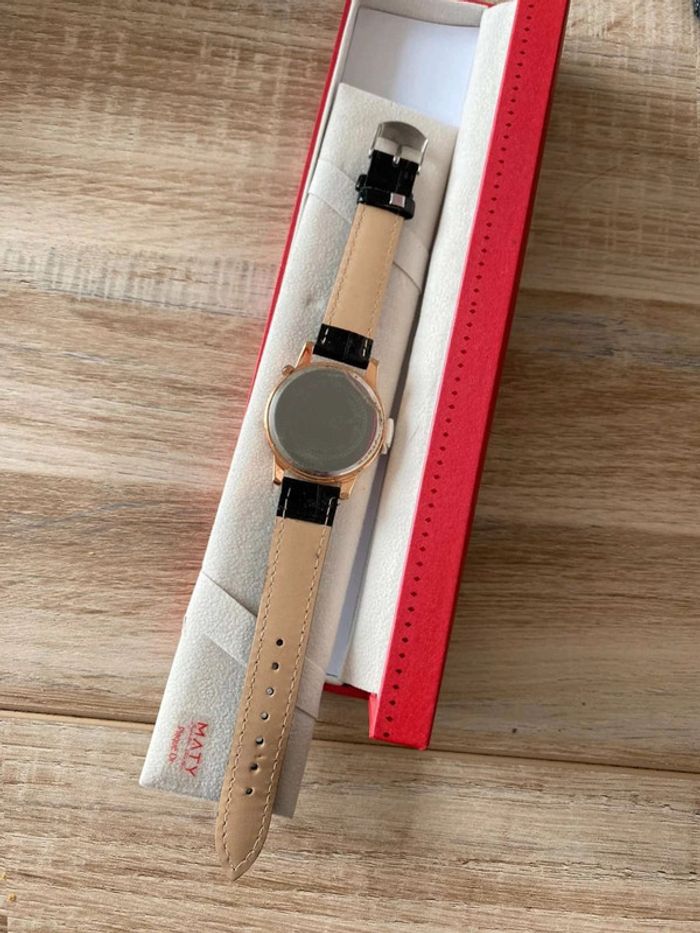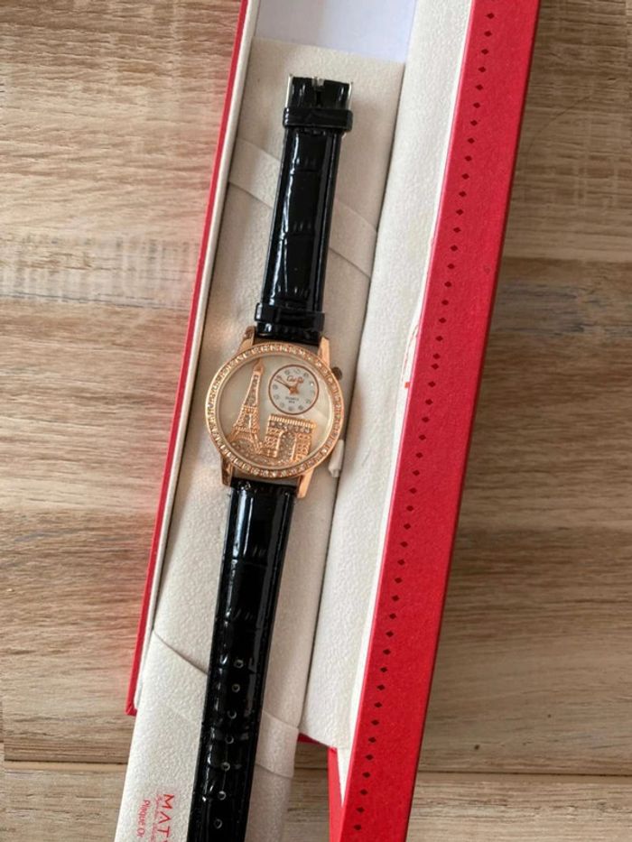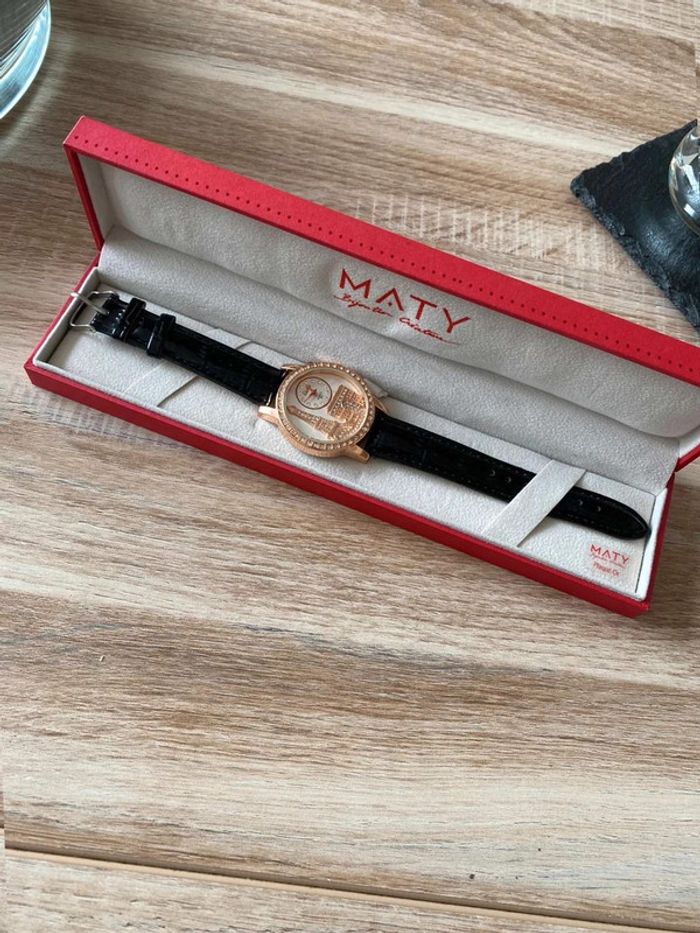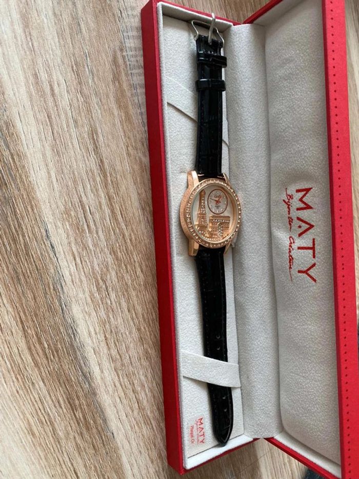 Montre Maty neuve Cadeau d’anniversaire, je suis amoureuse du bracelet mais je n’aime pas le cadran ! Très bon état, jamais mise Bracelet en croco noire, cadran avec la tour eiffel et l’arc de triomphe Ça fait un moment que je l’ai la pile est a changé… ⚠️ pile à changer