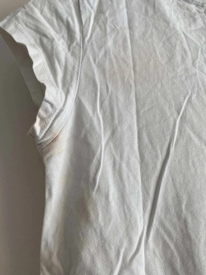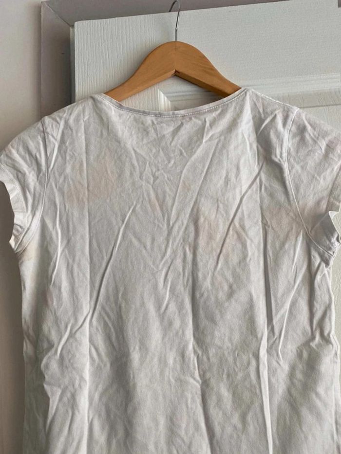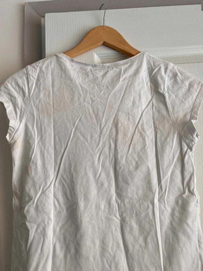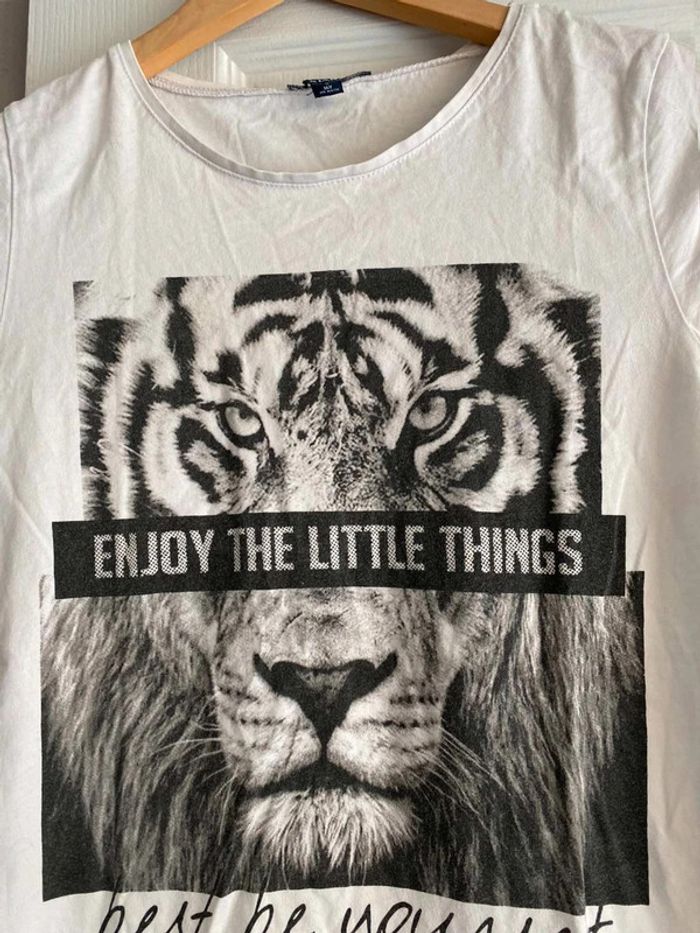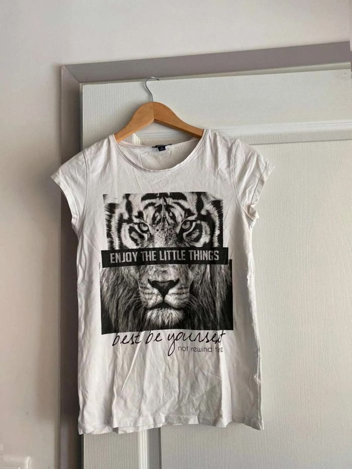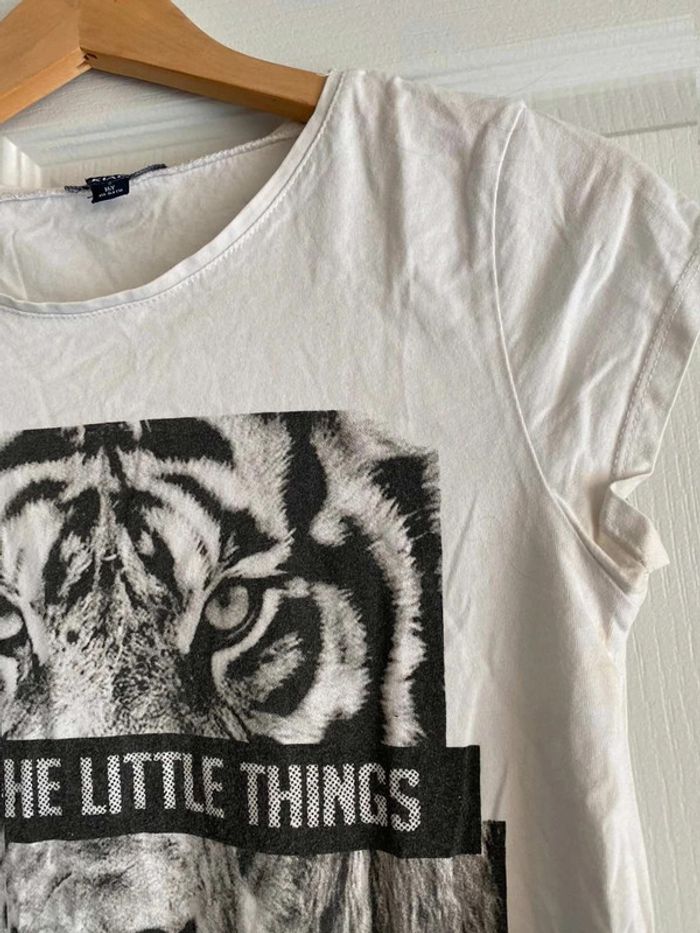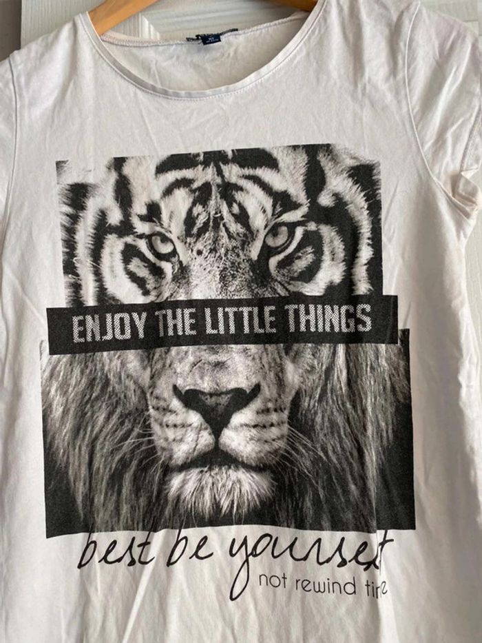 Tee shirt fille Logo tigre devant + écriture Uni derrière Plutôt bon état mais quelques taches au niveau des aisselles et au dos (taches oranger/jaune). (voir en photo)