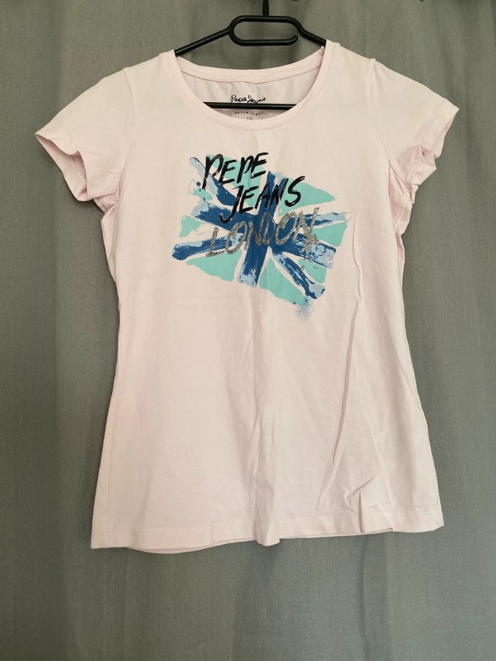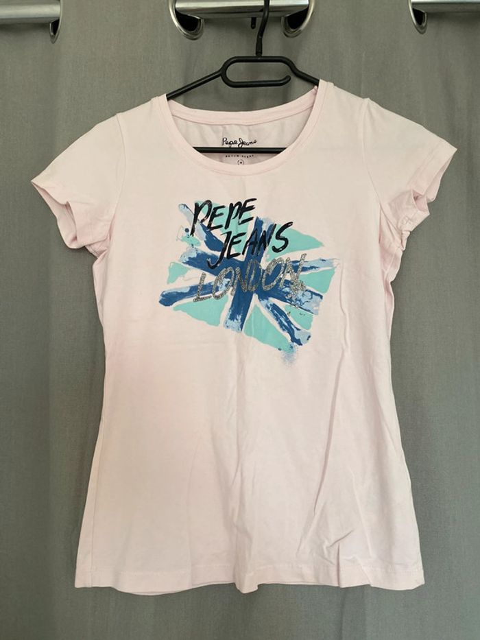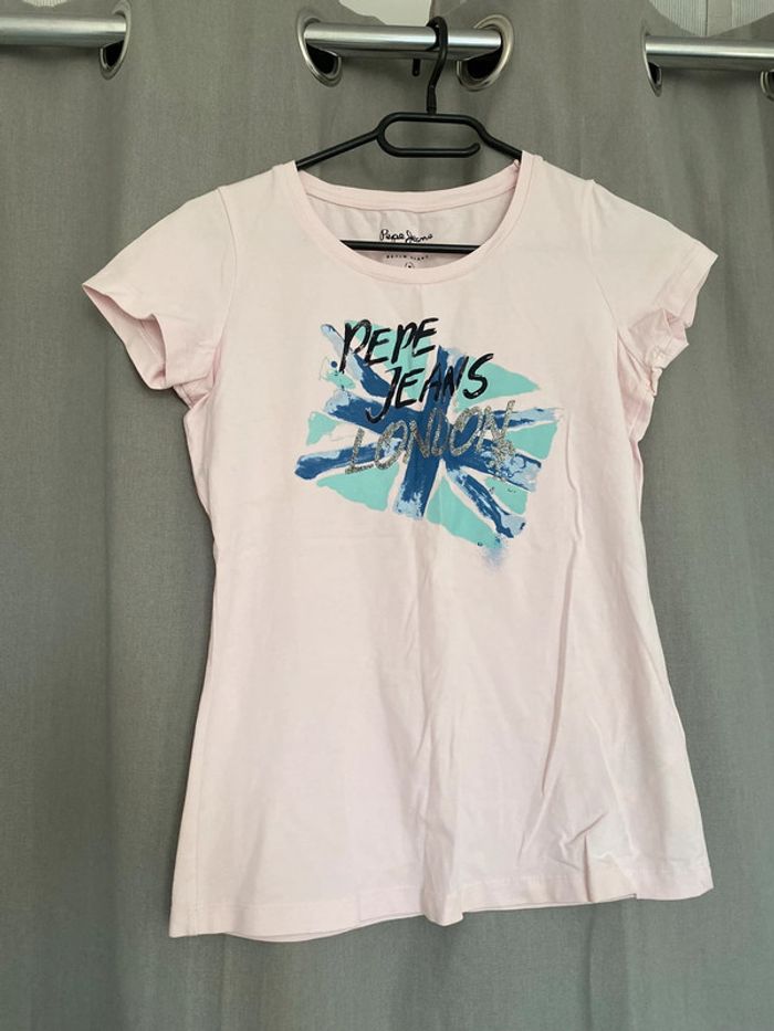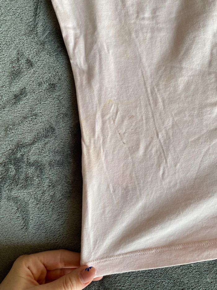 Tee shirt Tee shirt rose avec écriture et motifs devant Tee shirt très bon état devant Mais ⚠️ tâches à l’arrière (voir photos) Marque Pepe Jeans Taille M 8€