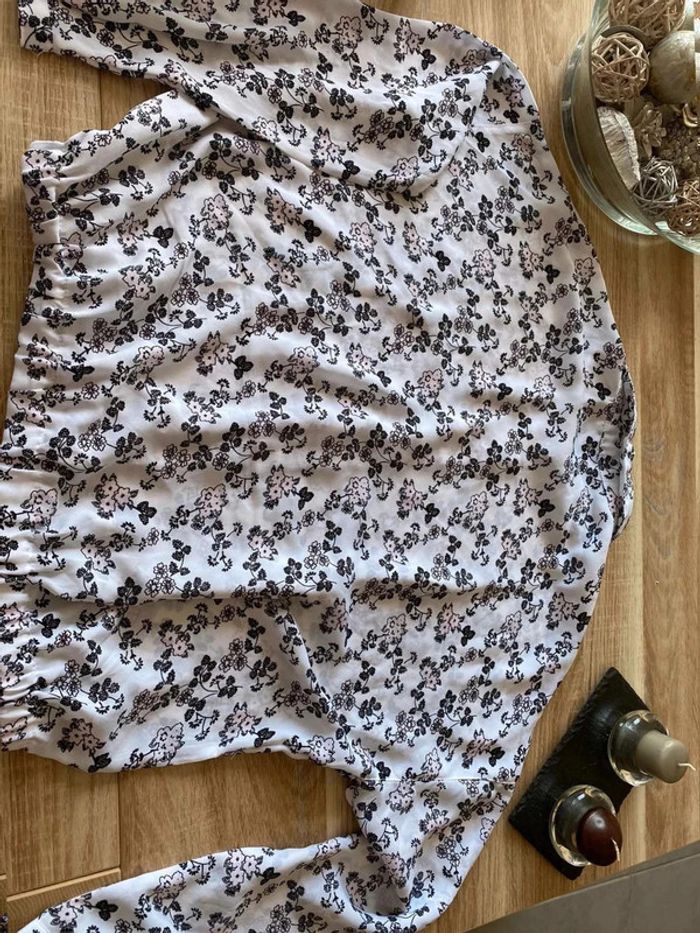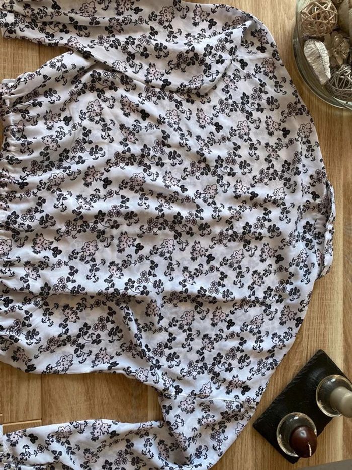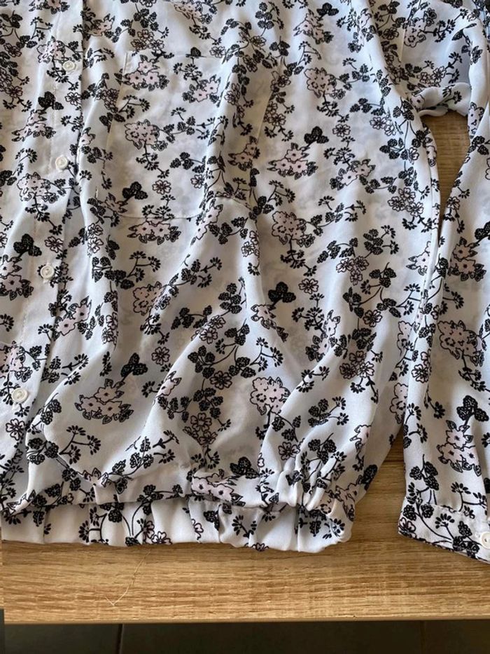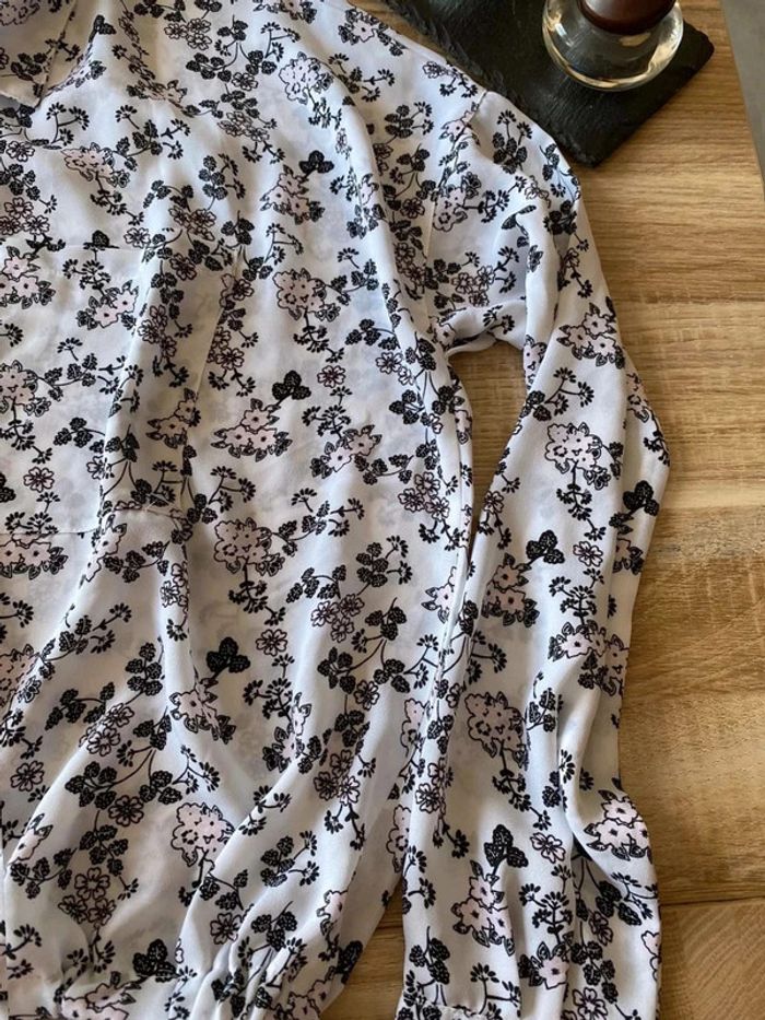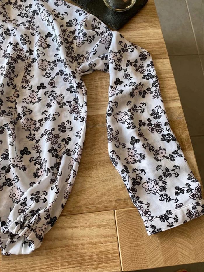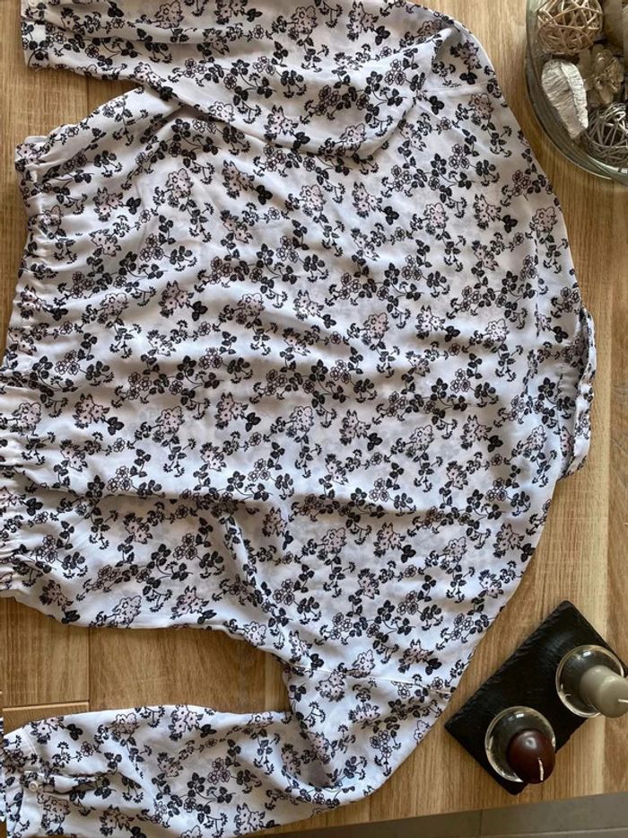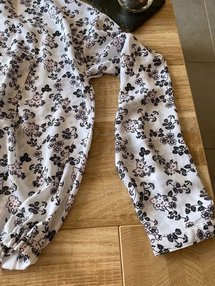 Blouse fluide Blouse fluide blanche fleurie, motifs fleurs noir et rose pâle Taille XS- porte que 2 fois Très bon état Élastique autour de la taille, poche sur la poitrine gauche - Matière très fluide