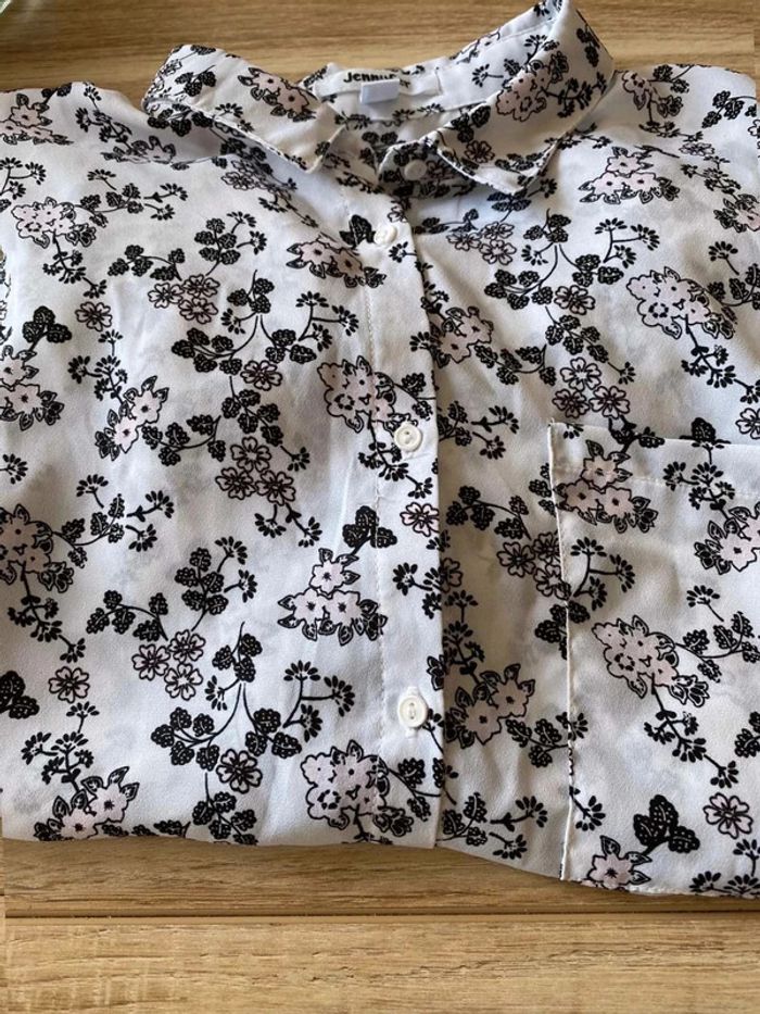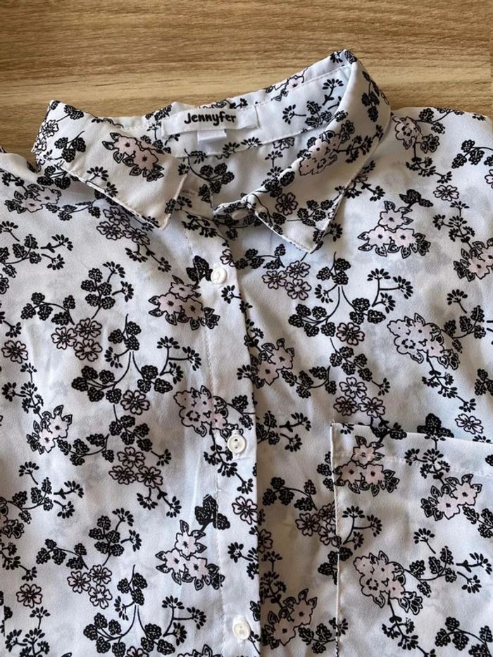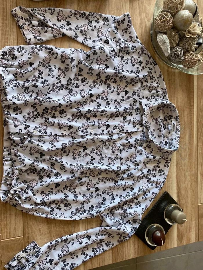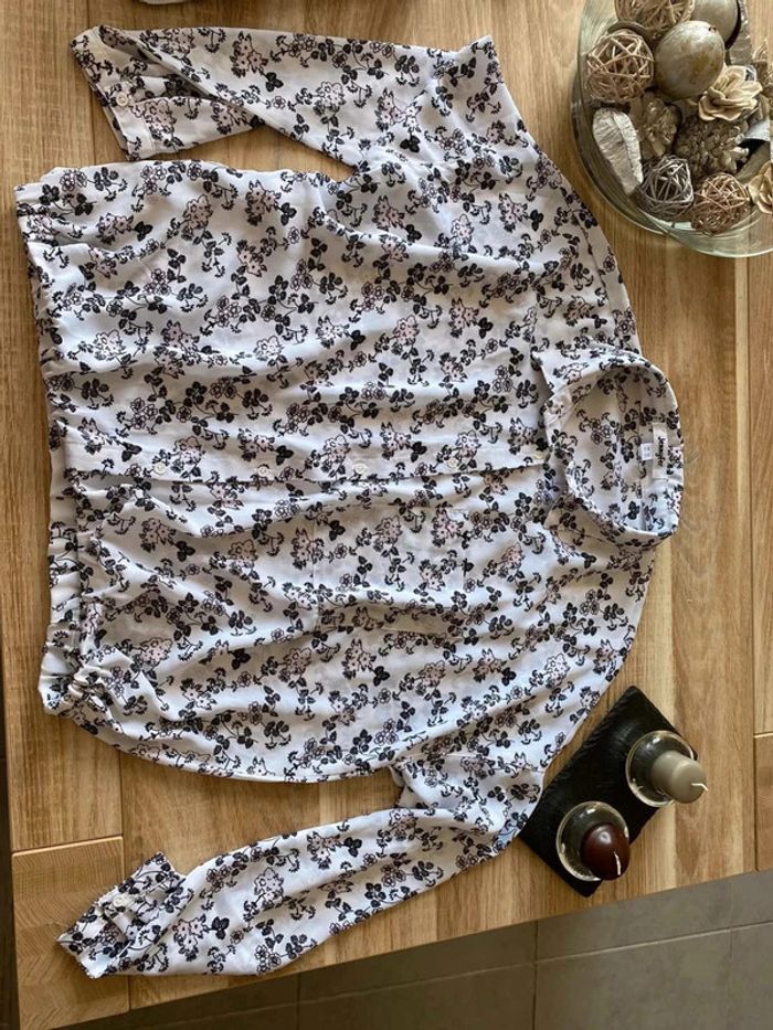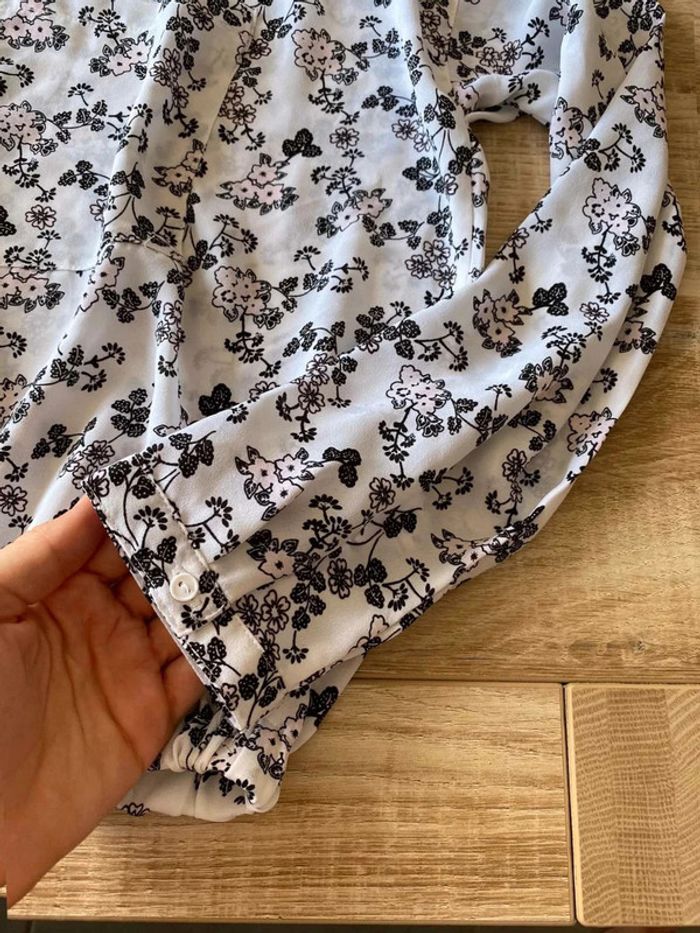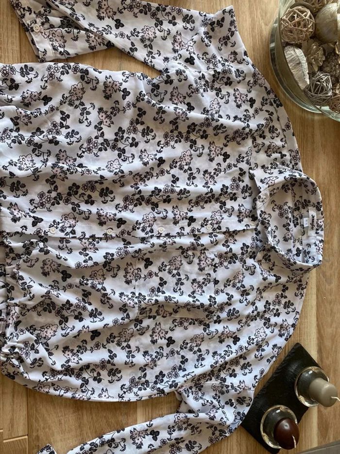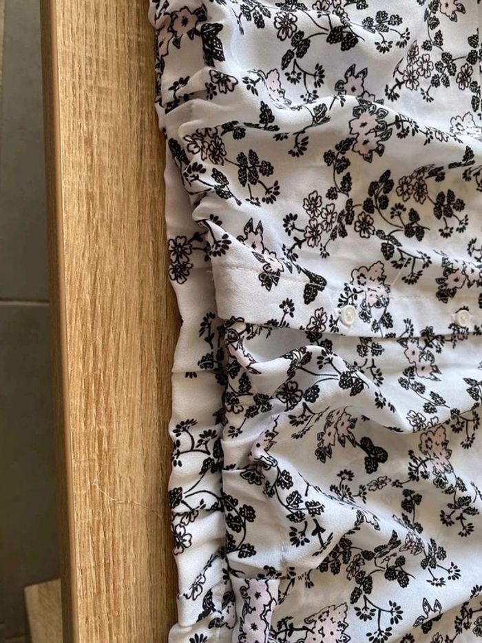 Blouse fluide Blouse fluide blanche fleurie, motifs fleurs noir et rose pâle Taille XS- porte que 2 fois Très bon état Élastique autour de la taille, poche sur la poitrine gauche - Matière très fluide