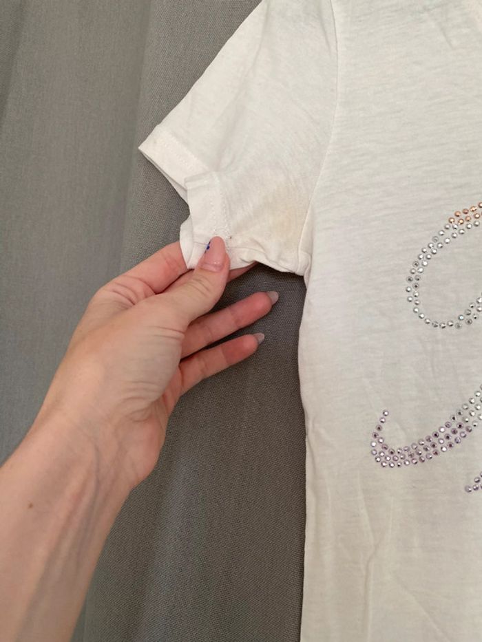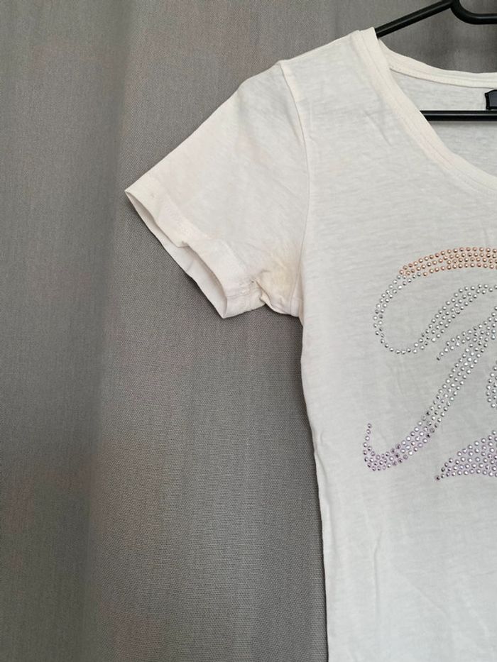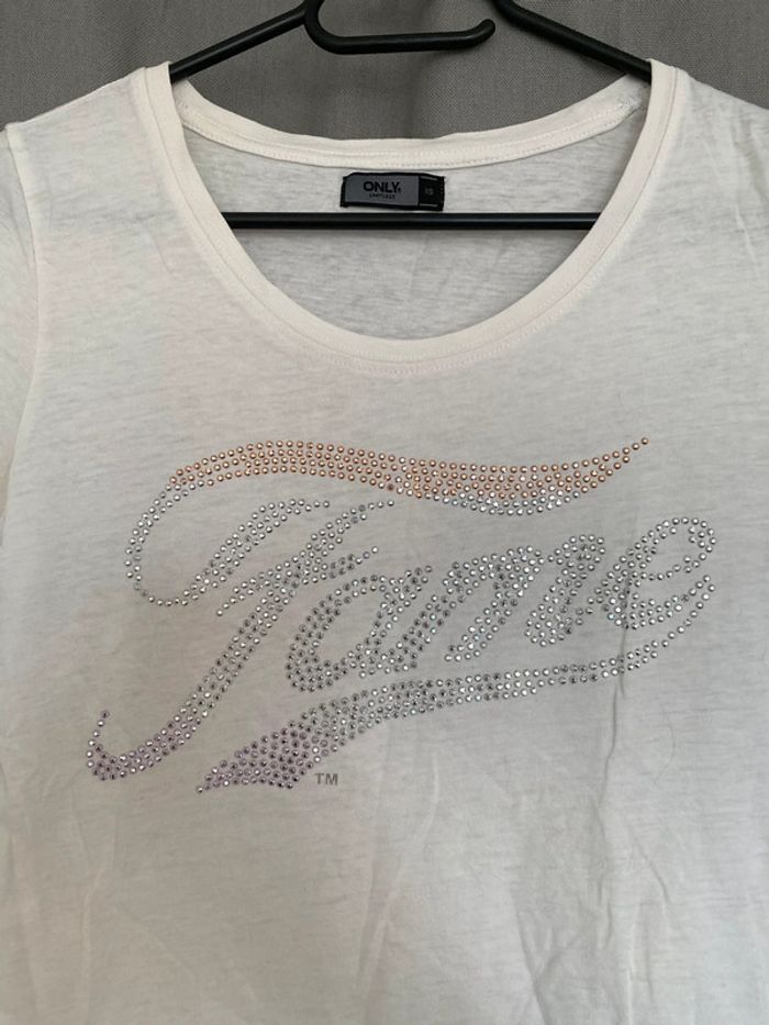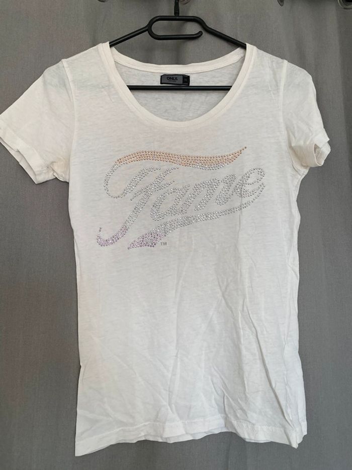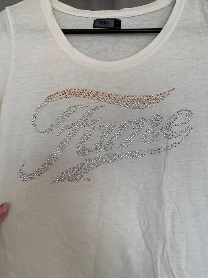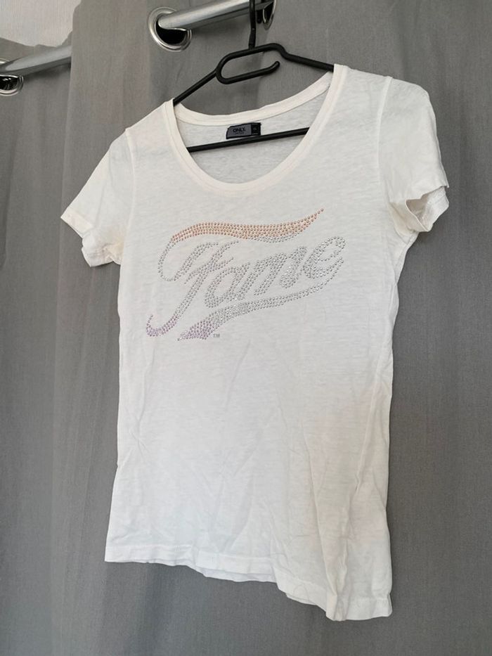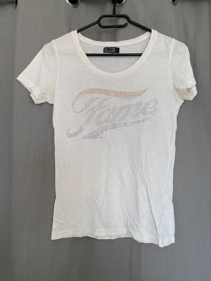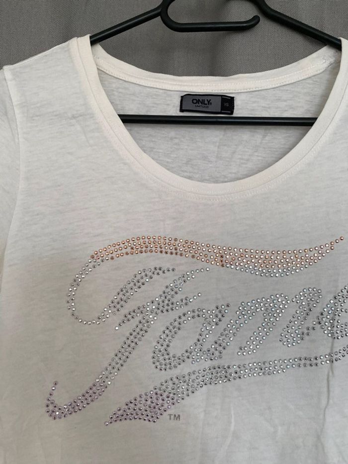Tee shirt Tee shirt blanc avec écriture à strass Tee shirt bon état mais ⚠️ jauni sous les bras et un peu au col Taille XS Marque Only 6€