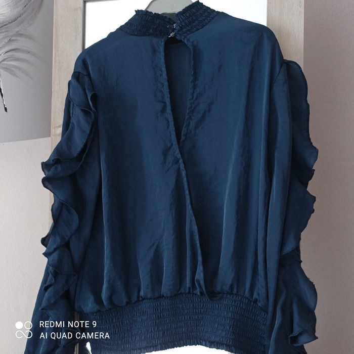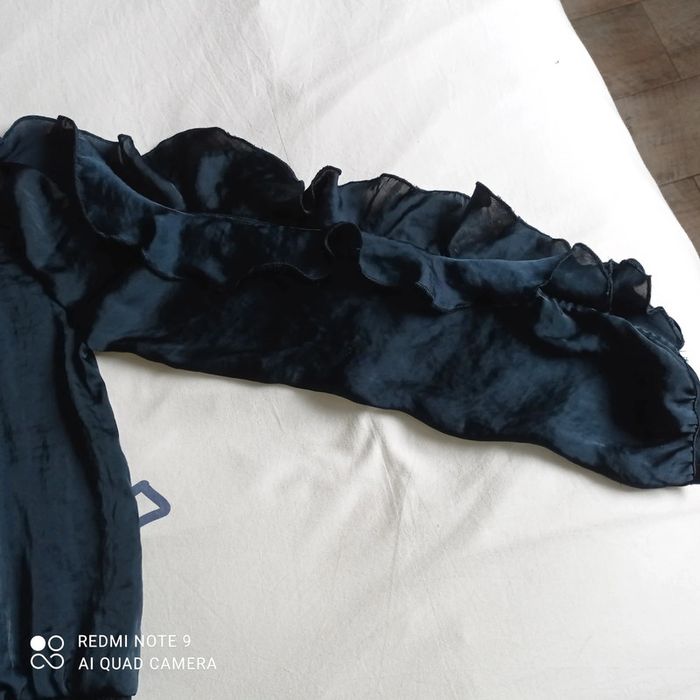 Chemisier satiné en excellent état. Bleu marine. Taille S. Jennyfer. Manches boutonnées sur la longueur avec ouvertures. Dos croisé ouvert. Pratiquement pas porté.