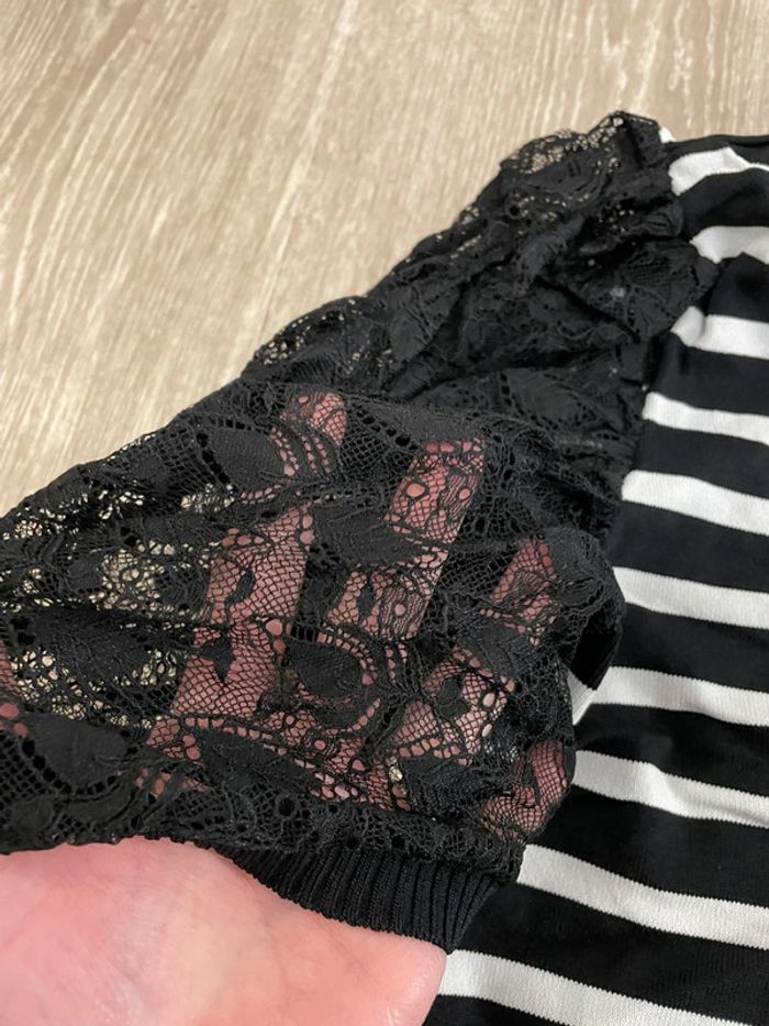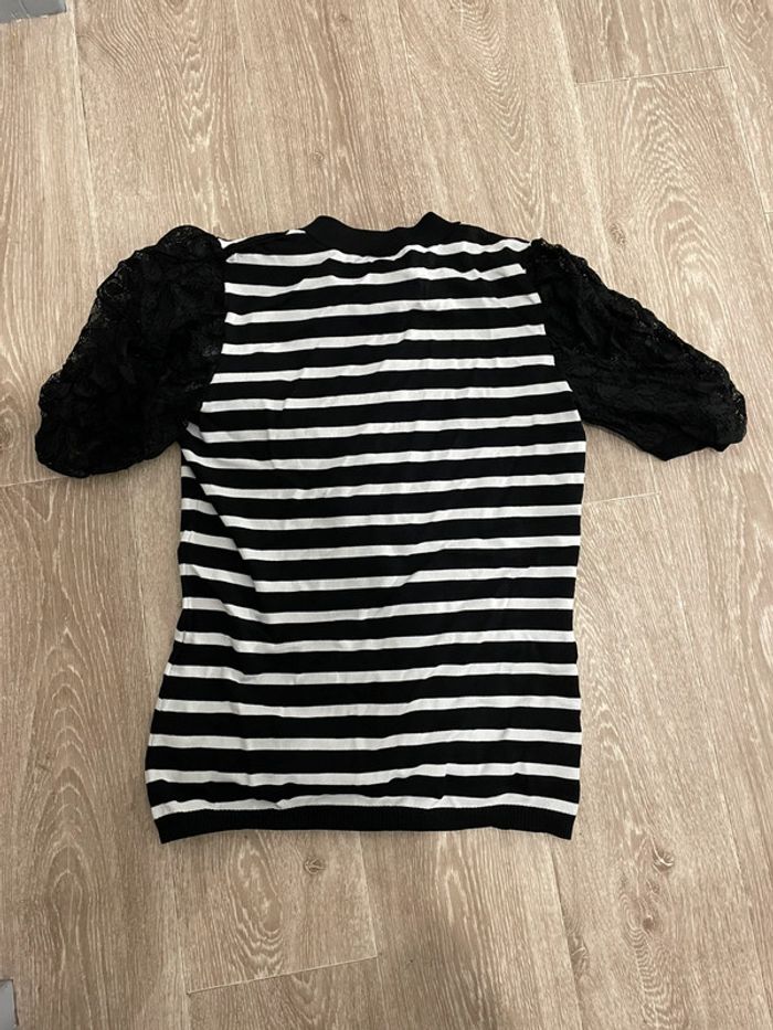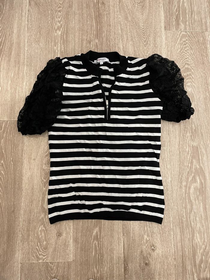 Tee shirt femme Excellent état peu porté à rayures blanc et noir avec manches bouffantes Taille L Marque Morgan