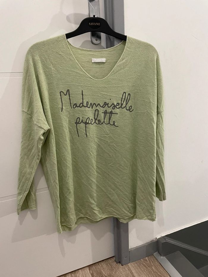 Pull fin vert clair Femme Col en V « Mademoiselle pipelette » Taille unique