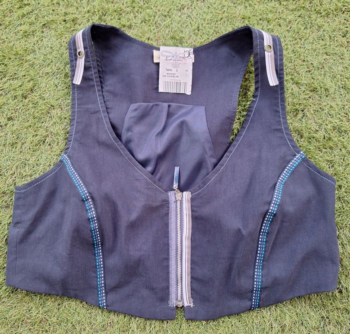GILET BOLERO SANS MANCHES DE LA MARQUE "LA MODE EST A VOUS" IL EST DE COULEUR BLEU MARINE AVEC DES COUTURES BLANCHES, BLEU FONCE ET BLEU TURQUOISE FERMETURE ECLAIR SUR LE DEVANT NEUF AVEC ETIQUETTE !