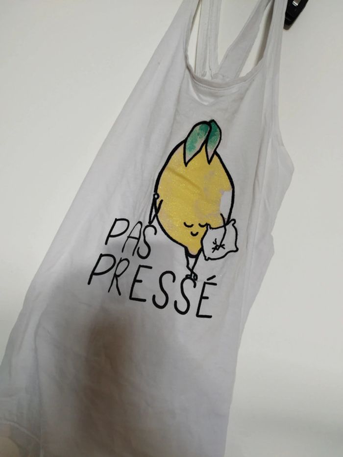 Haut croisé dans le dos débardeur citron je suis pas pressé Etam servi en pijama Bon état voir photo Réductions sur les lots activé 🙂 #urgent #pascher #lot #reductionsurleslots