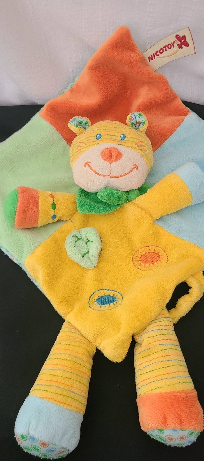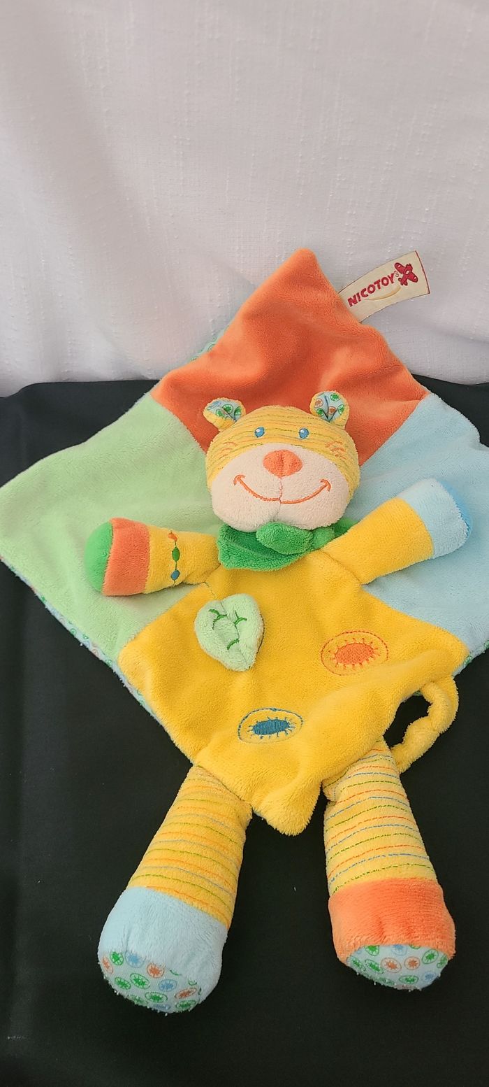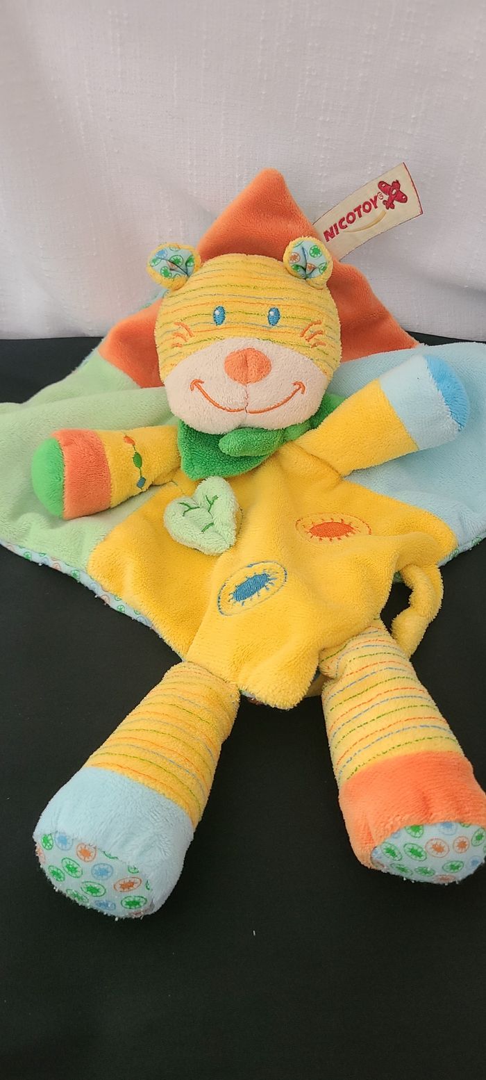 Doudou plat lion orange vert bleu jaune feuille POMMETTE