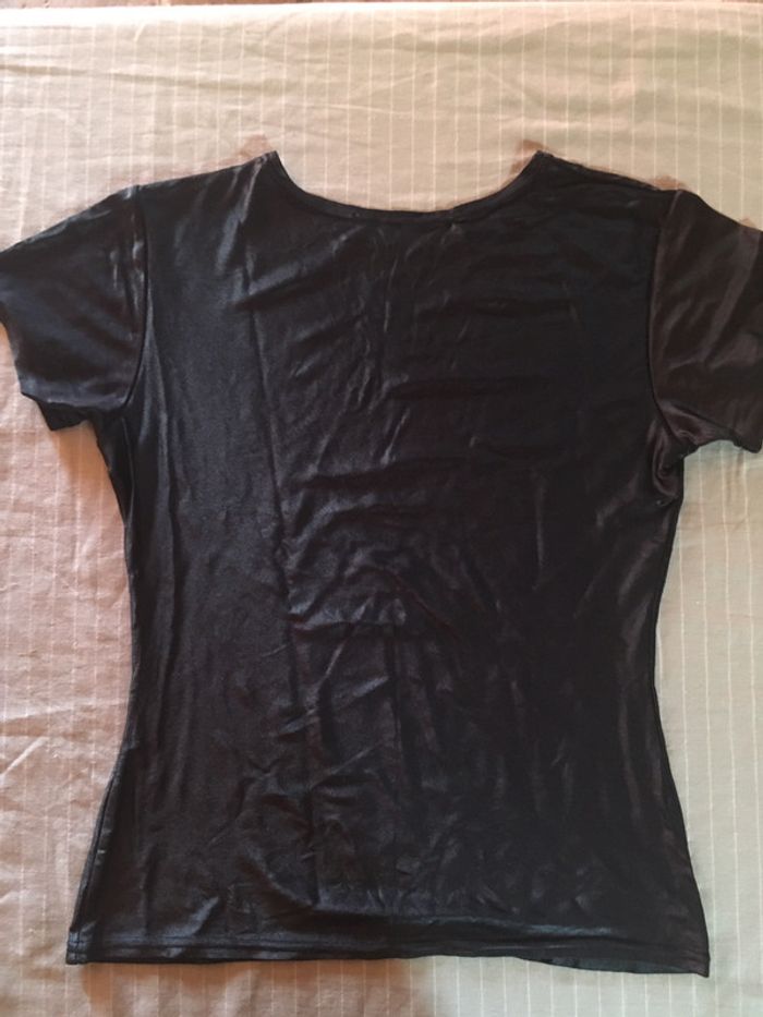 tee-shirt noir brillant, satiné, léger et très agréable à porter étiquette manquante mais correspond à une taille 36