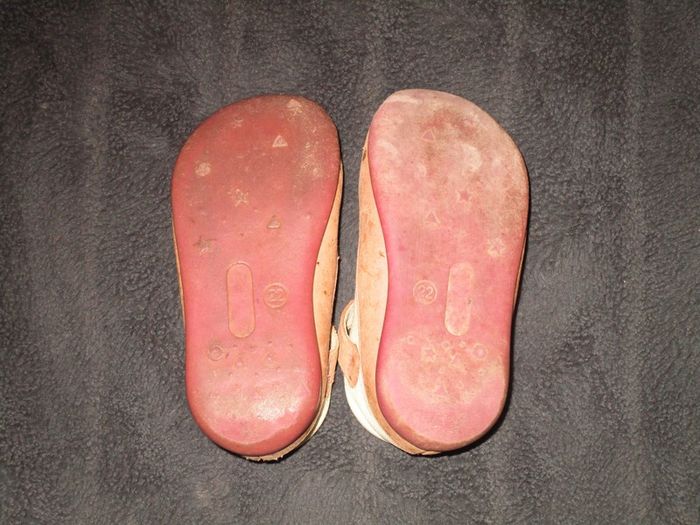 Motifs papillons et fleurs. Fermeture par scratch sur le côté. Semelles en cuir. #Iva32_Chaussures_enfant