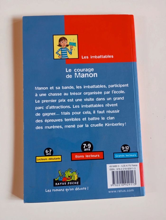 Manon et sa bande, les imbattables, participent à une chasse au trésor organisée par l'école. Le premier prix est une visite dans un grand parc d'attractions. Les imbattables rêvent de gagner... Mais pour cela, il faut réussir des épreuves terribles et battre le clan des murènes, mené par la cruelle Kimberley ! Éditeur ‏ : ‎ Editions Hatier 61 pages Âge de lecture ‏ : ‎ 6 - 8 ans Dimensions ‏ : ‎ 11.5 x 0.4 x 18 cm Livre en très bon état #chasseautrésor #épreuve