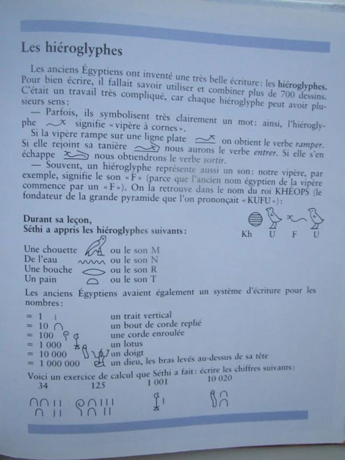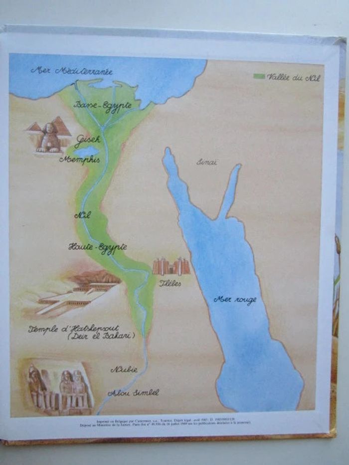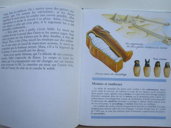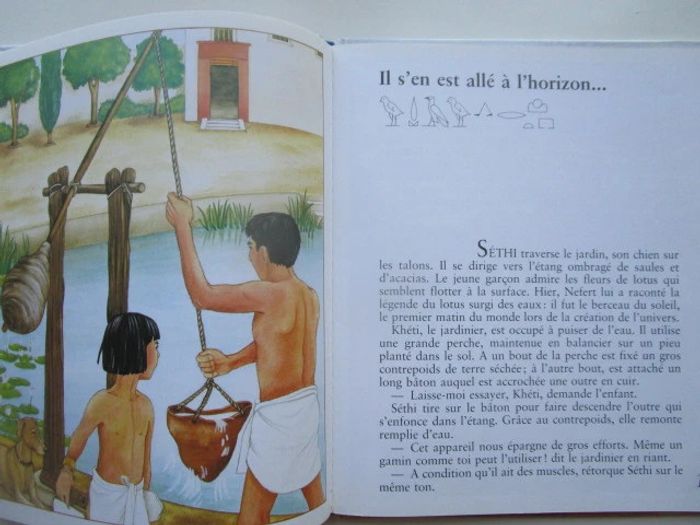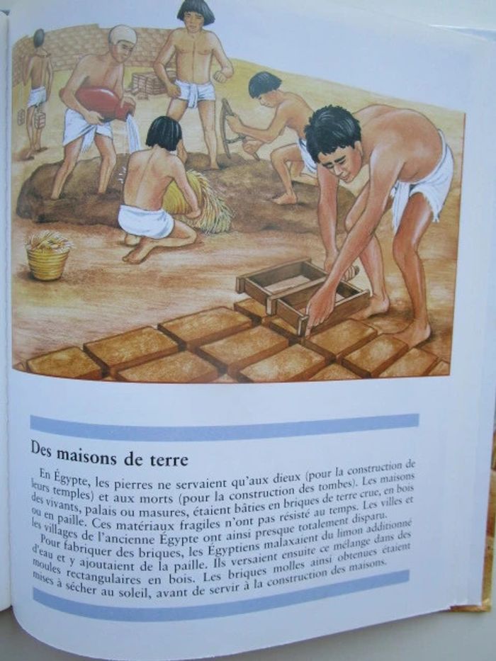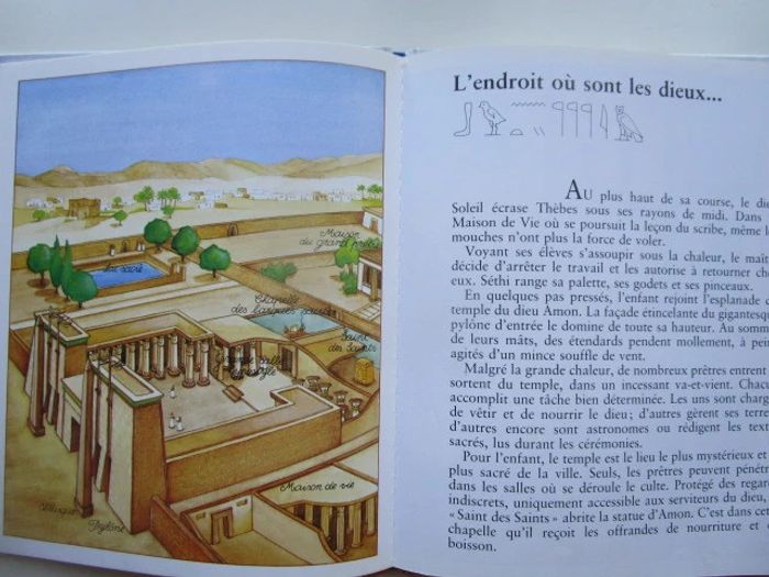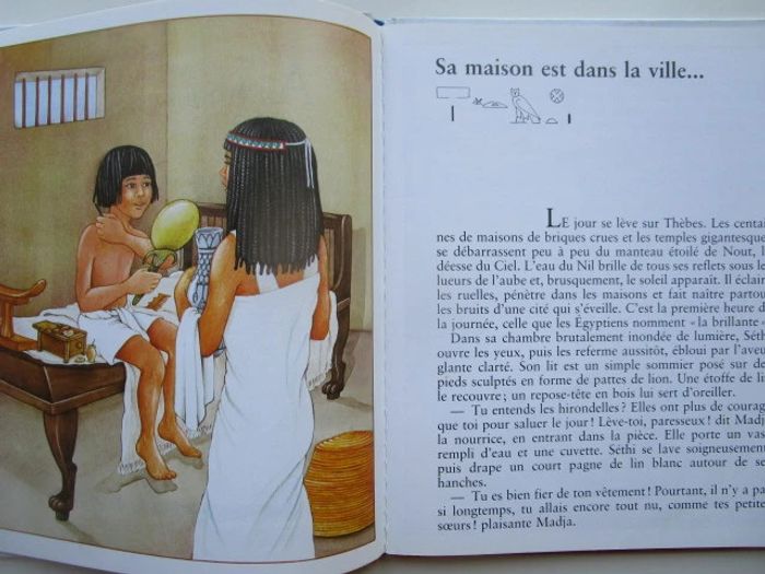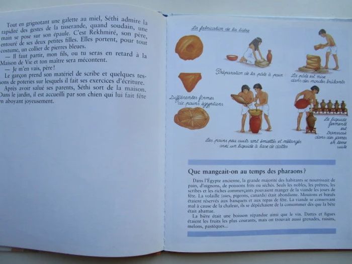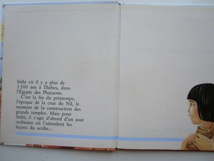 C'est le récit d'un moment de la vie de Séthi qui réside en Égypte voici plus de 3 500 ans, c'est l'époque de la reine Hatchepsout. Le récit commence à la fin du printemps, un moment où le Nil est en crue. Nous nous rendons à Thèbes où le père de notre héros est tisserand. Séthi apprend le métier de scribe et cela nous vaut des explications multiples, l'une d'entre elles autour du papyrus et une autre au sujet du papyrus. De nombreux sujets sont traités, avec un nombre variable d'illustrations pour accompagner le texte, comme la fabrication de la bière, les funérailles, les dieux, les maisons en terre, les crocodiles du Nil, jeux d'enfants ... Les illustrations occupent globalement la moitié de la surface et on a souvent une plaine page sur le même sujet, le style est celui des encyclopédies pour enfants, on n'hésite pas en particulier à décomposer les actions (comme pour la fabrication de la bière), à pratiquer le dessin en plongée pour rendre compte dans une même image à la fois de l'extérieur et de l'intérieur d'un palais de pharaon. Éditeur ‏ : ‎ Casterman 46 pages Âge de lecture ‏ : ‎ 6 - 9 ans Dimensions ‏ : ‎ 21.6 x 0.8 x 25.8 cm Livre en très bon état Je vends d'autres livres sur l'Egypte #phil_peg_égypte ou de la même collection #phil_peg_journaldenfant #histoire #égypte #pharaon #nil #scribe