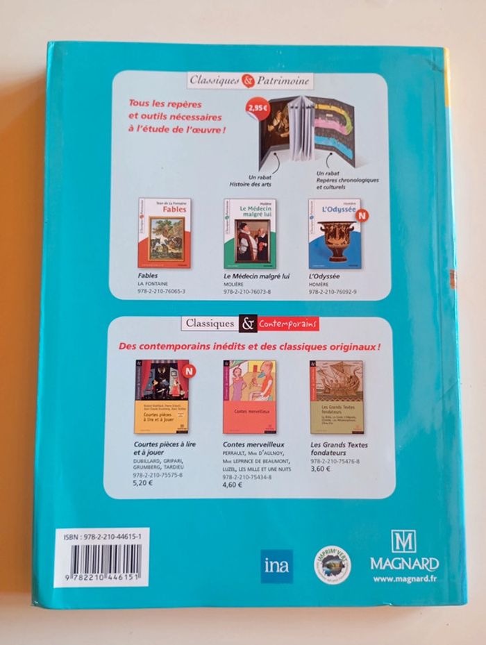 Le livre unique qui allie culture littéraire et approche visuelle de l’étude de la langue Se constituer des repères littéraires, culturels et artistiques 15 dossiers Histoire des arts avec des approches variées. Une rubrique « Je construis ma culture » pour retenir les œuvres et auteurs essentiels. Motiver les élèves avec une approche visuelle de l’étude de la langue Des leçons progressives structurées en étapes : observation, apprentissage, entraînement. Des schémas bilan pour faciliter la mémorisation de la leçon. Des phases « Récapitulons » pour faire le point sur plusieurs leçons. Des exercices simples sur les fondamentaux, des exercices de dictée, d’écriture courte et de réécriture. Une démarche pédagogique adaptée à la classe de 6e Différentes façons d’aborder les textes (extraits courts, longs, textes intégraux) pour éveiller la curiosité de l’élève et s’adapter à l’hétérogénéité des classes. Des questionnaires progressifs et synthétiques terminés par un bilan. Des pages de vocabulaire et d’expression orale et écrite (écriture courte et longue). Des pages « Méthode » dans chaque chapitre pour maîtriser les principaux savoir-faire. Éditeur ‏ : ‎ MAGNARD 384 pages Dimensions ‏ : ‎ 19.5 x 1.6 x 27 cm Livre état NEUF Je vends d'autres livres scolaires #phil_peg_livrescolaire #français #manuelfrançais #6è #cycle3 #collège #manuelscolaire #magnard #jardindeslettres