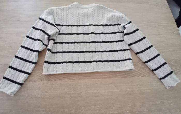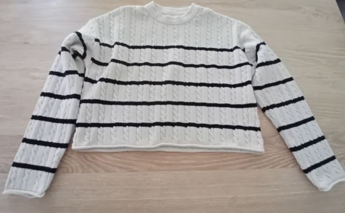 Pull court fille de marque Zara en très bon état. Taille : 13/14 ans Couleur : crème et bleu marine. Pull façon marinière et petites torsades. #fille14anssigtmoi #zarasigtmoi