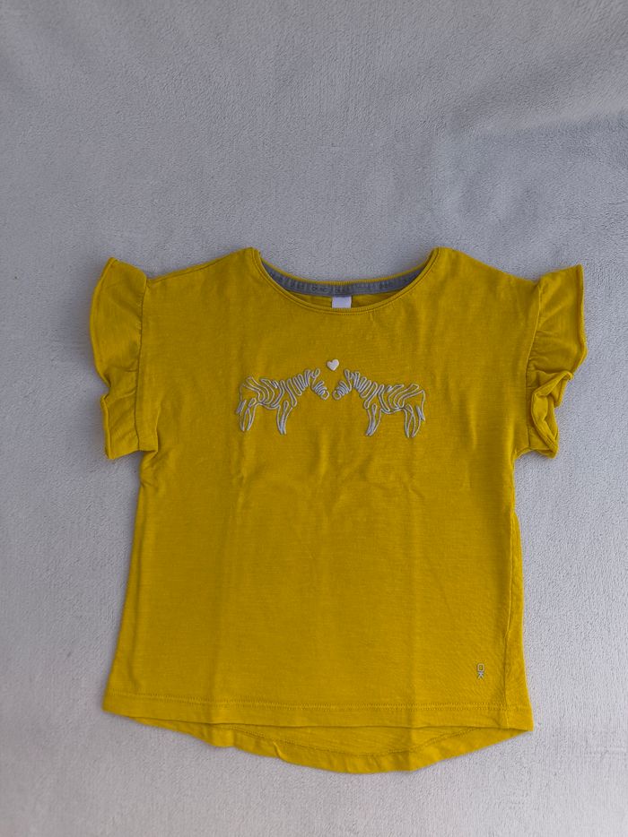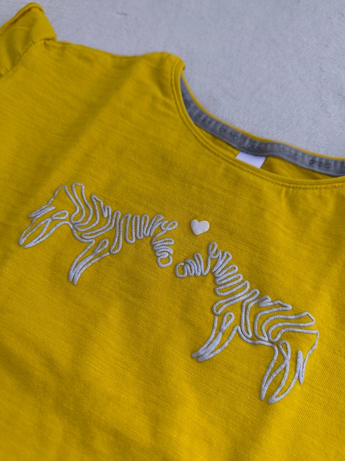 T-shirt à manches courtes Marque Okaïdi Taille 5 ans, 110 cm • Coloris jaune moutarde, argenté • Imprimés en relief zèbres • Épaules volantées • Tissu fin En très bon état #evelyne_filles_5ans #evelyne_filles