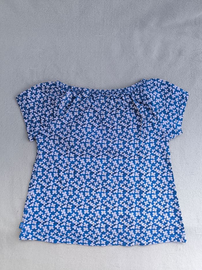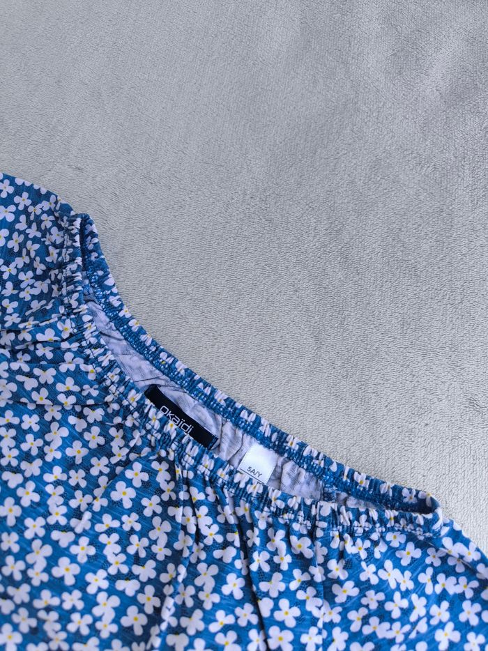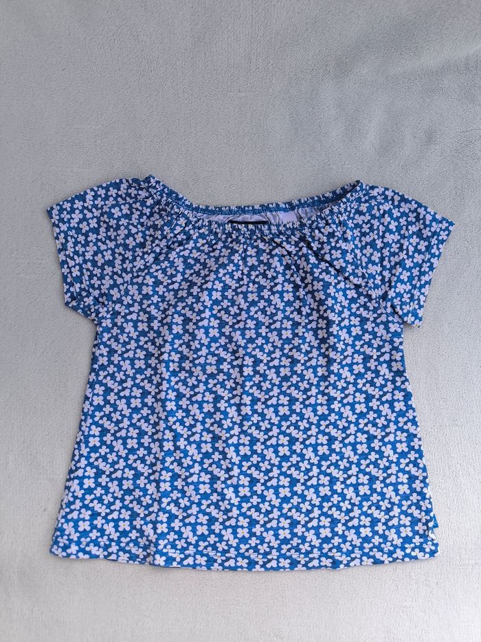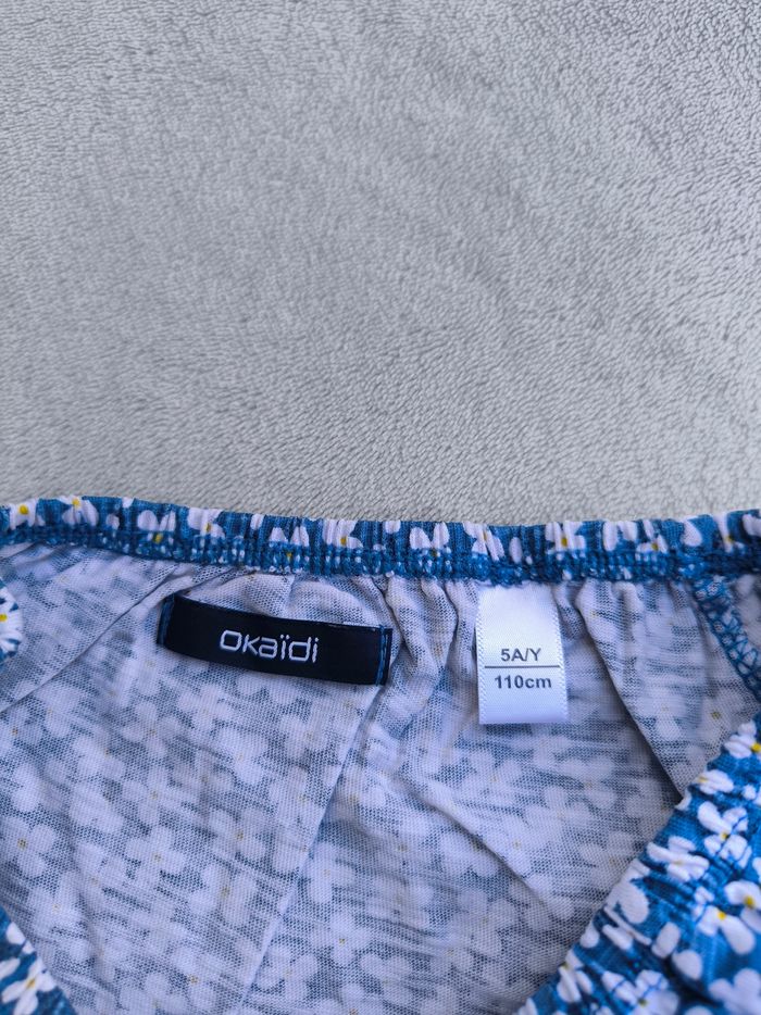 T-shirt à manches courtes Marque Okaïdi Taille 5 ans, 110 cm • Coloris bleu, blanc, jaune • Imprimés fleurs • Col élastique • Tissu fin En très bon état #evelyne_filles_5ans #evelyne_filles