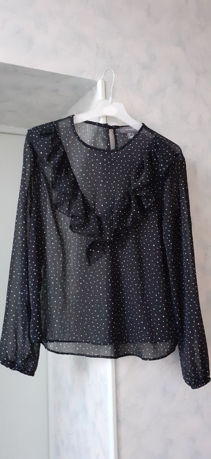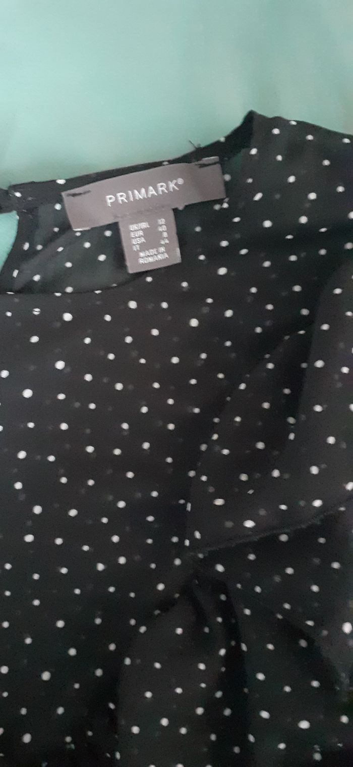Vends une blouse en voile transparente, 100 % polyester, volant en V sur le buste, élastique aux poignets, couleur noir à petits pois blanc, marque Primark, taille 40 EUR 40-42. Longueur de l'épaule à la base : 56 cm Largeur aisselle à aisselle : 49 cm.