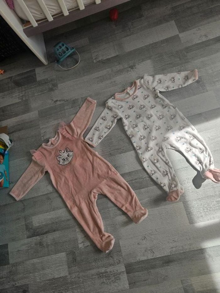 Lot de pyjamas en velours, Marie de Disney portés quelques fois. Il y a juste une petite tâche derrière la cuisse du pyjama blanc (photo 3) sinon ils sont en excellent état. Tulle en relief entre les épaules et les bras. Taille 18 mois
