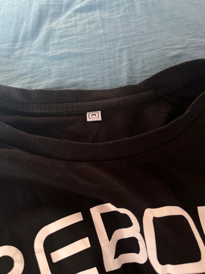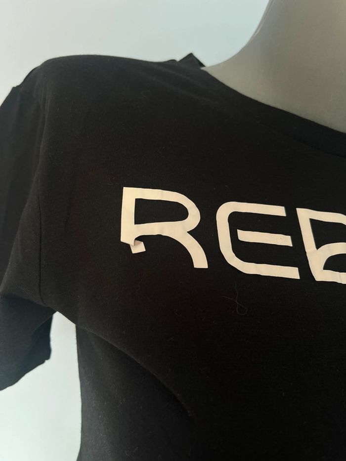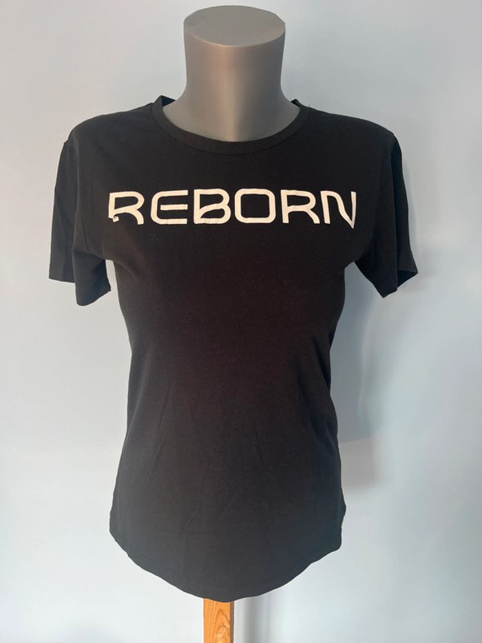 T-shirt à manches courtes noir avec imprimé blanc « Reborn » Certaines lettres commencent à se décoller. Taille : M Pour les autres articles de la même taille : #HautFemmeMrbspauline