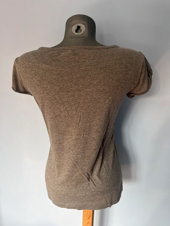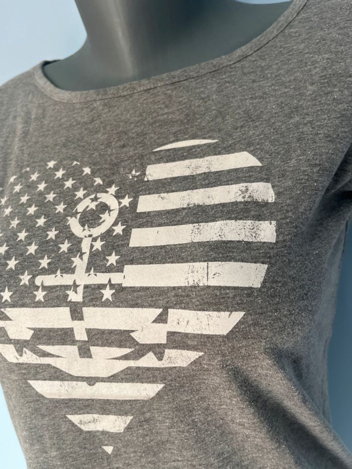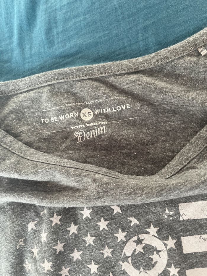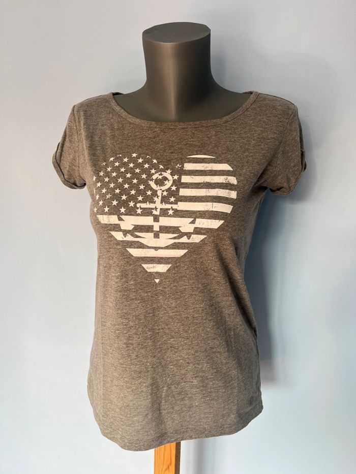 T-shirt à manches courtes gris avec un imprimé blanc. Une jolie ancre dans un cœur. Marque : Tom Tailor Denim Taille : XS Pour les autres vêtements de la même taille : #HautFemmeXSrbspauline