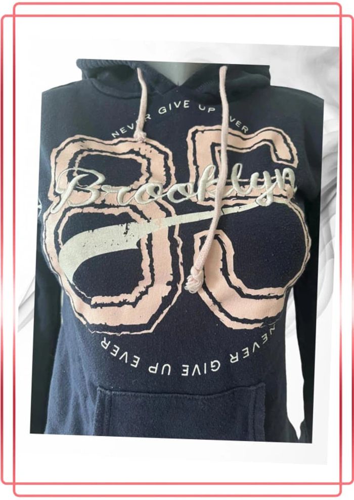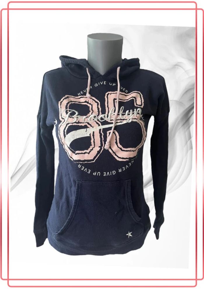 Sweat à capuche bleu avec imprimé rose et blanc. Poche centrale sur l’avant Marque : Cache cache Taille : 0 #HautFemmeXSrbspauline #HautFemmeSrbspauline