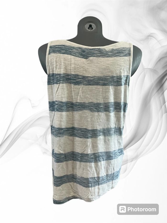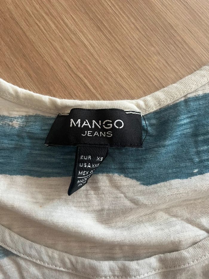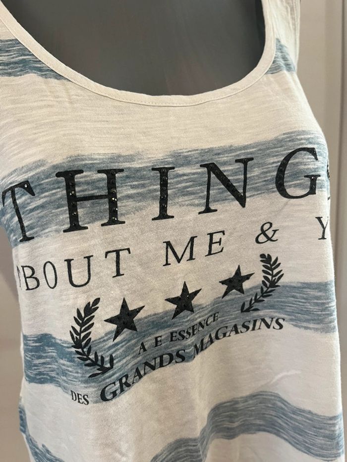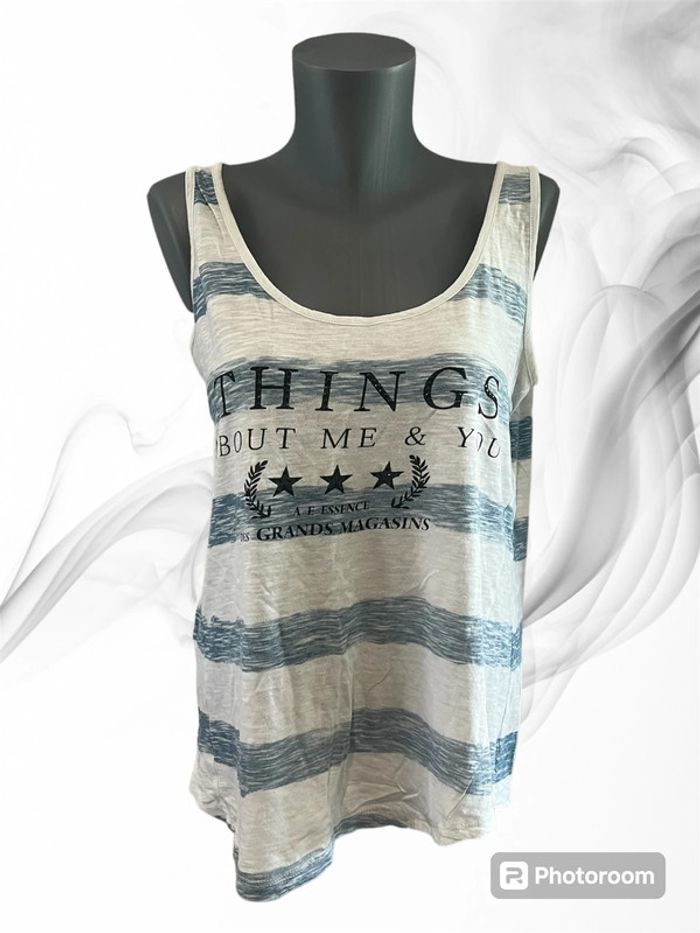 Débardeur rayé bleu et blanc avec imprimé noir Marque : Mango Jeans Taille : XS mais plutot large #HautFemmeXSrbspauline #HautFemmeSrbspauline