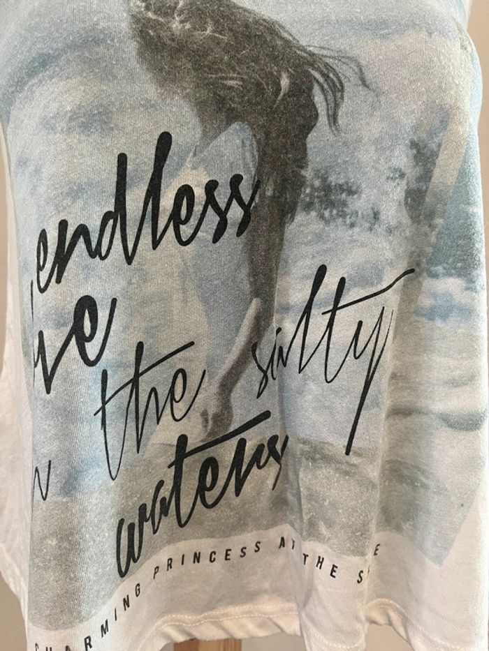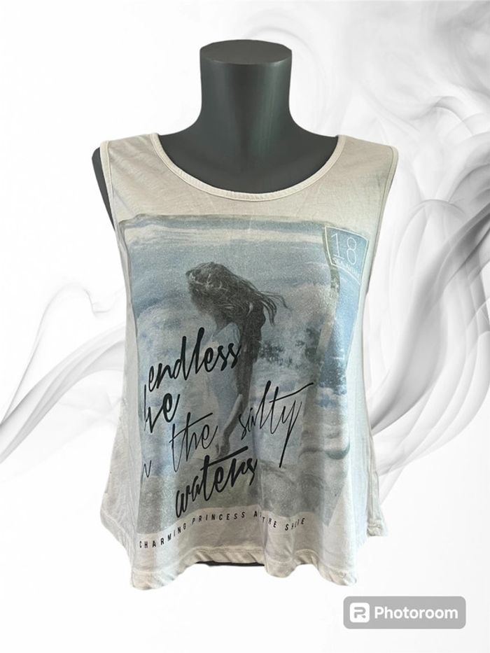 Débardeur blanc avec imprimé dans les tons bleus sur l’avant Tissu légèrement bouloché Marque : Jennyfer Taille : M #HautFemmeMrbspauline