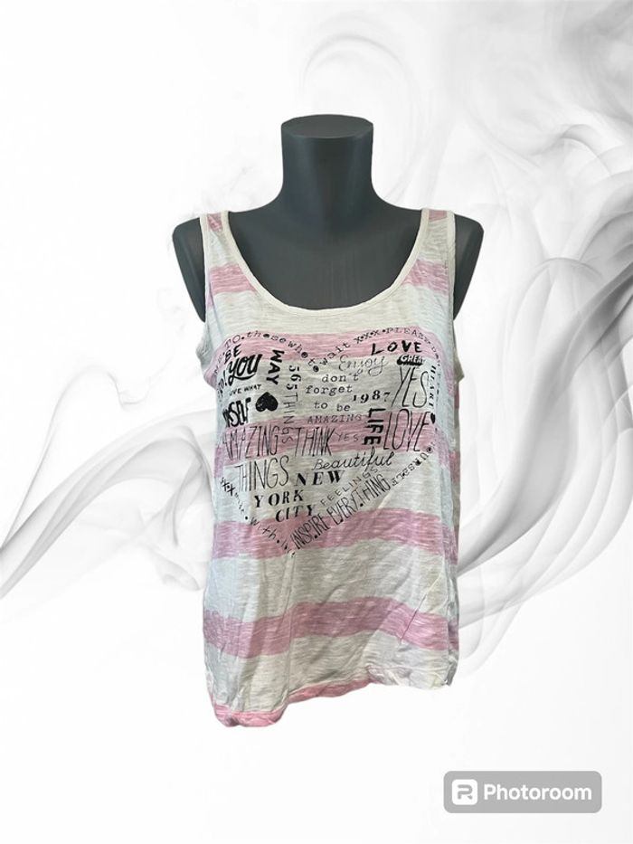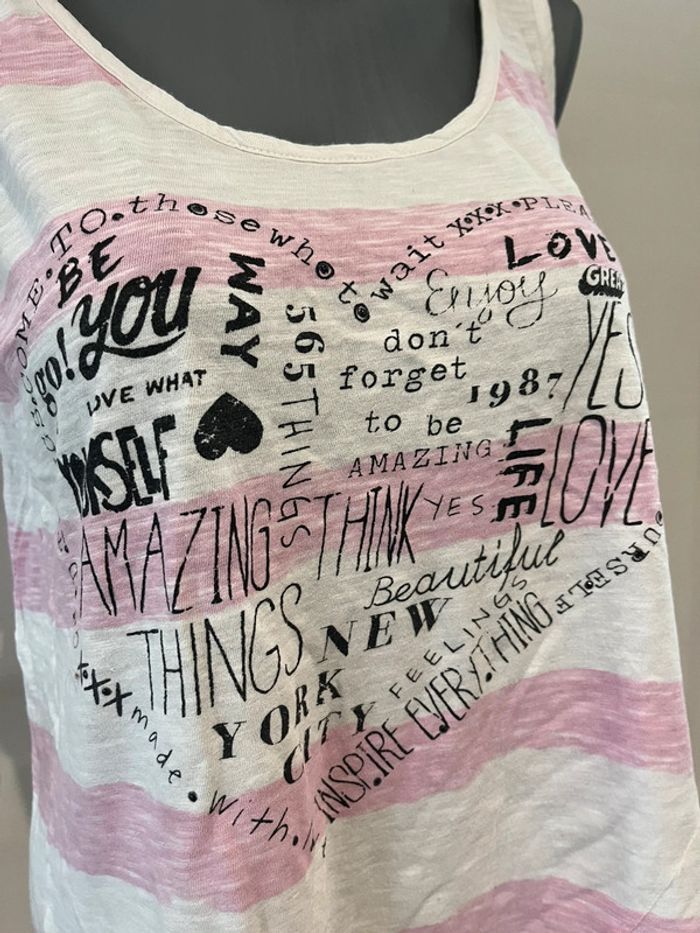 Débardeur rayé de blanc et de rose avec imprimé en cœur noir sur l’avant Marque : Mango Jeans Taille : S #HautFemmeSrbspauline