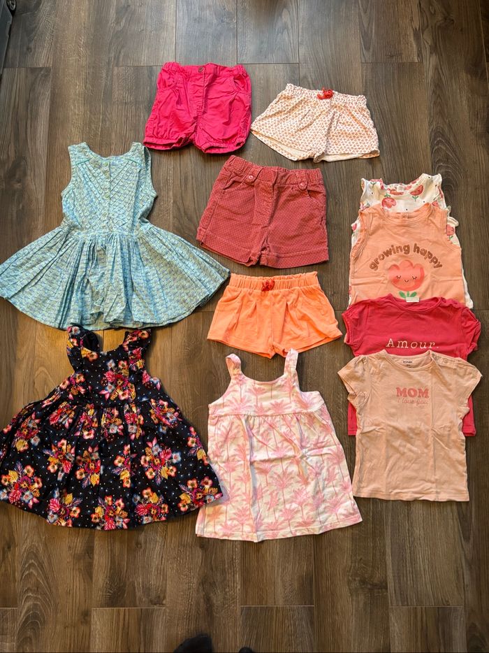 Lot de 11 belles pièces taille 18 mois : - 1 robe DPAM - 1 robe Obaïbi - 1 robe Tex - 4 shorts - 4 tee-shirts Le short rose fluo a une micro tache mais tout le reste est en excellent état. Lot pouvant être scindé et possibilité d’acheter à l’unité. Pour d’autres tailles, n’hésitez pas à consulter mon profil.