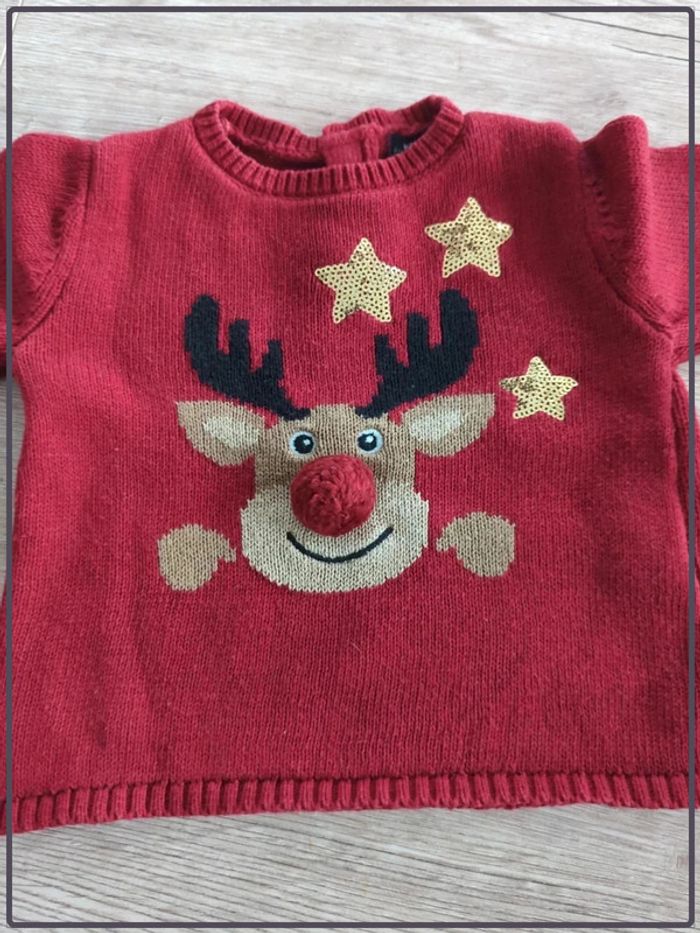 Pull de Noël, renne avec nez rouge en pompom et étoiles brillantes. 3 boutons derrière pour la fermeture. #fille6moisgameirot