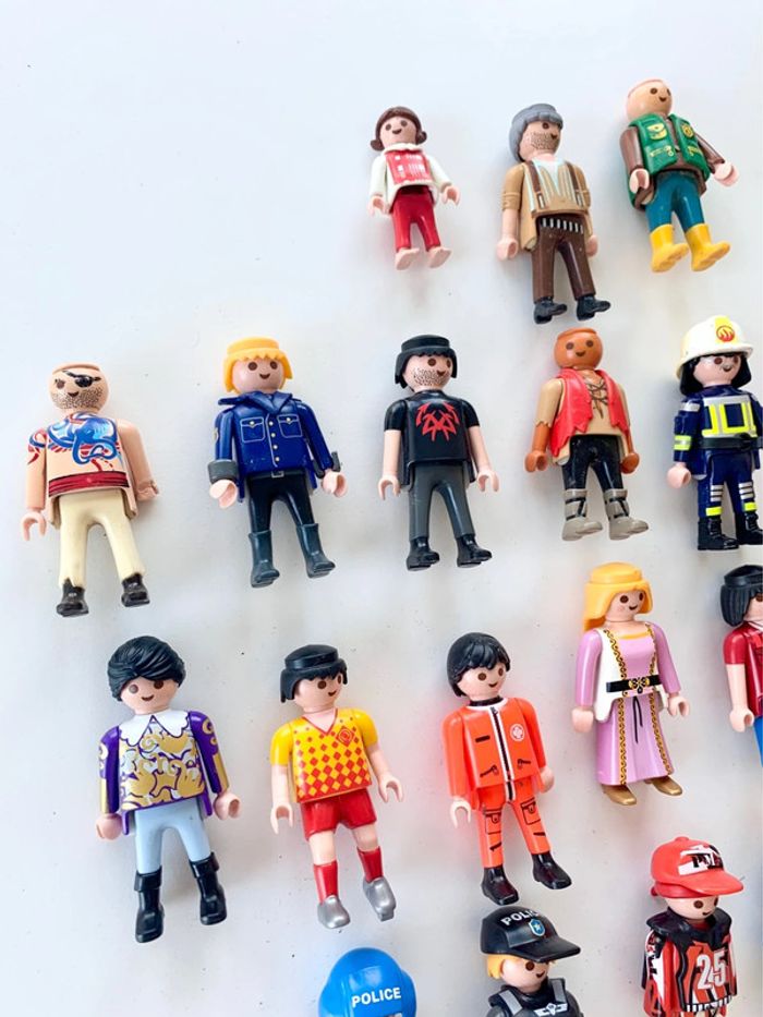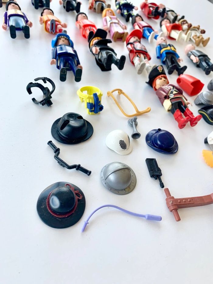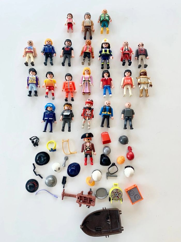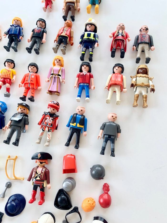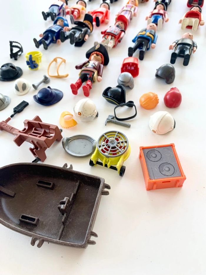 Vous trouverez tout type de personnages, outils, chapeaux, casques etc dans ce lot indissociable garde forestier, enfant, fille, pirate, policier, biker, pompier, footballeur, secouriste, chevalier, barque, gazinière, chevelures, etc Les 6 personnages du bas ont une main manquante ou cassée