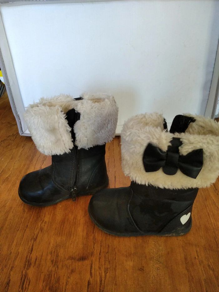 jolie paire de bottines fourrées noeud noir sur les cotés fermeture éclair coté intérieur portées et des traces sous les semelles. pointure 20 #ladyminuit18mois #ladyminuit24mois