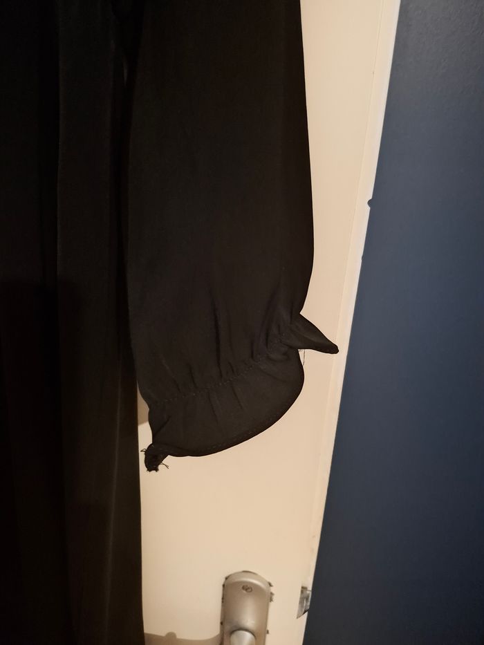Robe noire fluide, très bon état, décolleté cache cœur. Resserrée sous la poitrine, longueur mi mollet, fentes sur le coté