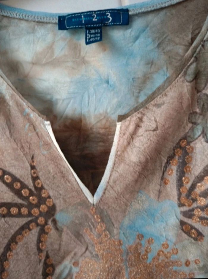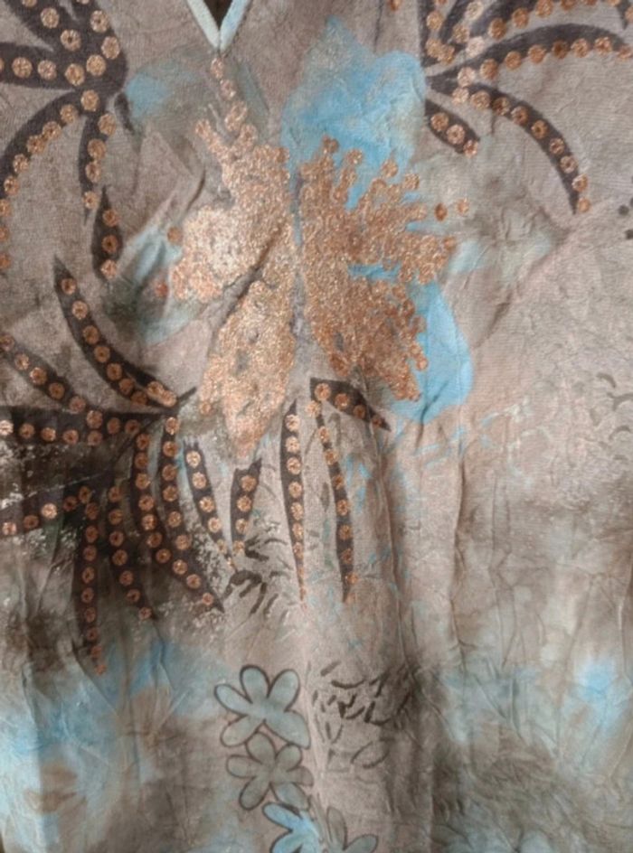 Tous mes articles sont triés par les tailles. Découvrez mon dressing et créez le lot pour économiser sur les frais de port. #vetfem_lisa_38 Débardeur marque 123, encolure ronde avec petit V, motifs floraux avec paillettes bronze, tissu effet froissé. épaules 30 cm aisselles 46 cm longueur 58 cm