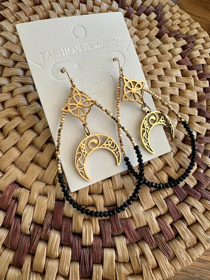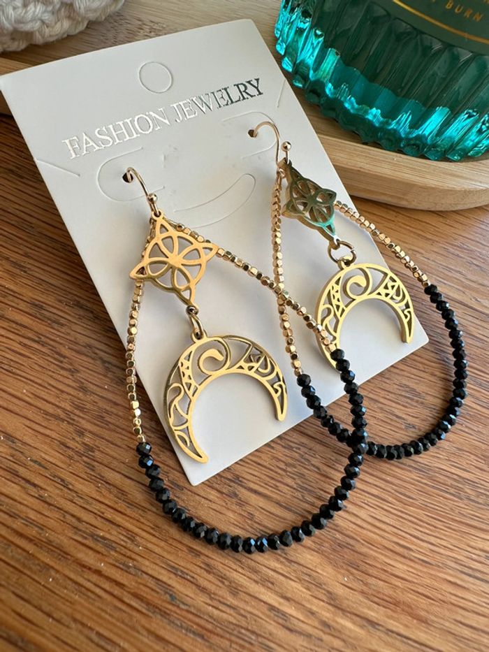 Superbes boucles d’oreilles de créateur, en acier inoxydable doré en forme de lune orné d’une étoile dans une goutte de fines perles cristal nacrées noires et dorées Hauteur 6 cm Largeur 4 cm