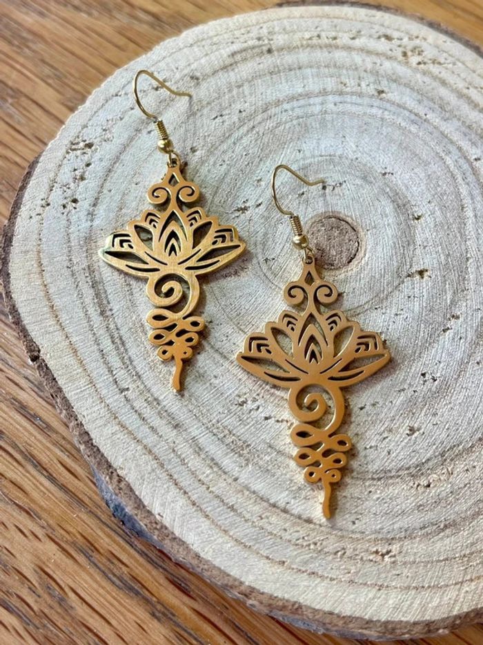 Boucles d’oreilles pendantes dorées en acier inoxydable Forme lotus floral Comme neuves