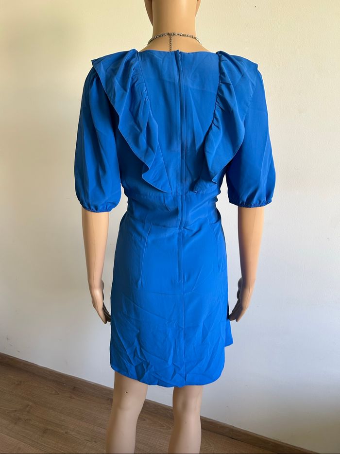 Jolie robe bleue à manches courtes, de marque Naf Naf. Fermeture dans le dos. Taille 36. Elle est neuve avec étiquette (valeur 50€). aisselle à aisselle 44 cms épaule à épaule 36 cms taille 38 cms longueur depuis épaule 86 cms 100% polyester