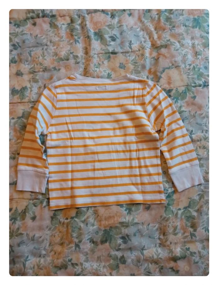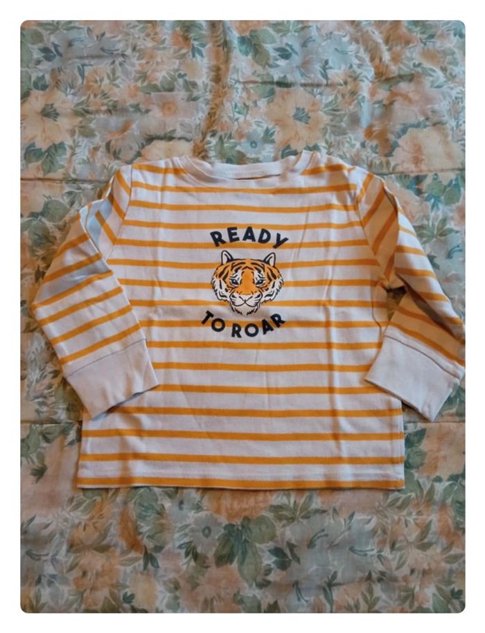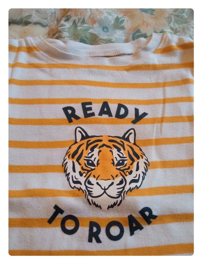 T-shirt manches longues jaune à rayures blanc motif tête de tigre de chez Kiabi en 4 ans. T-shirt bien porté encore en très bon état #aurelie6251garcon4ans