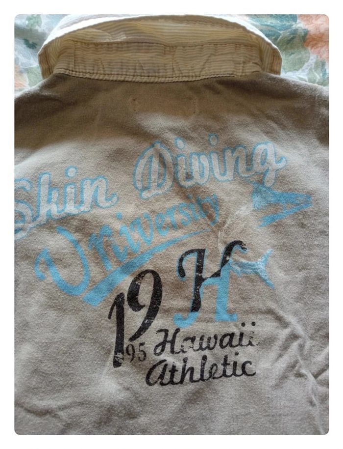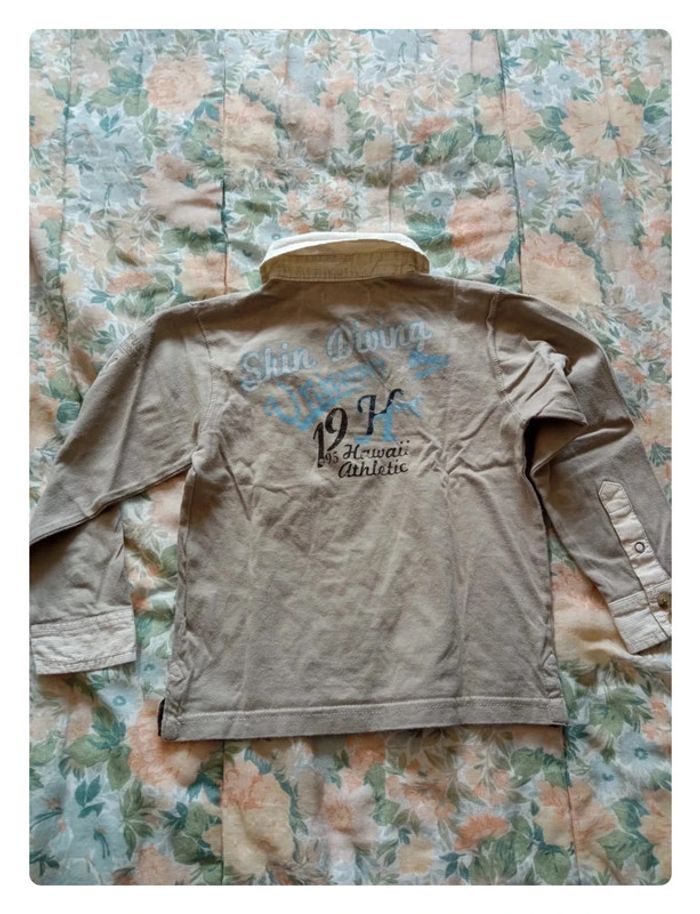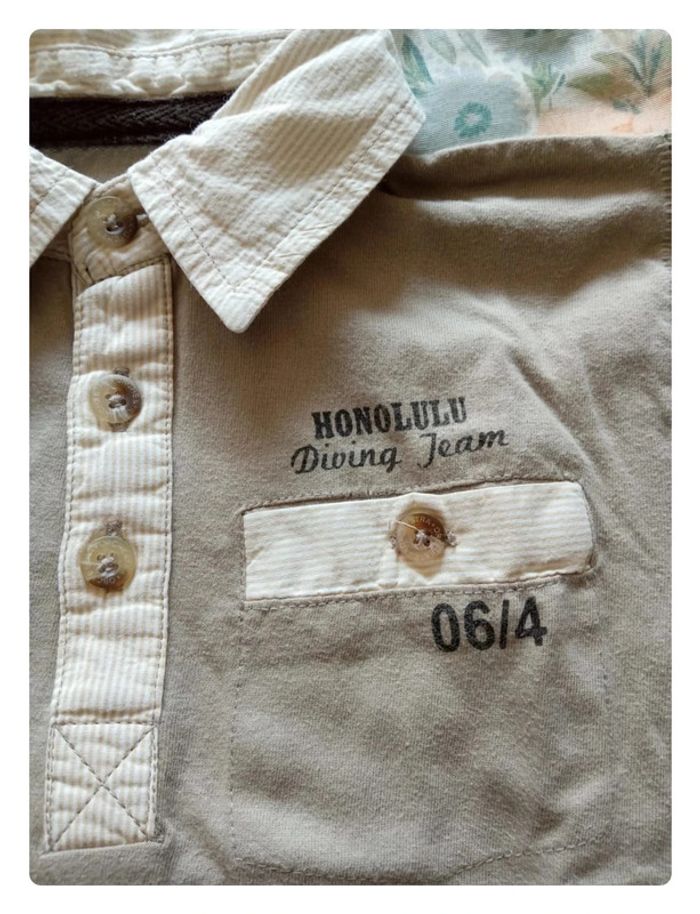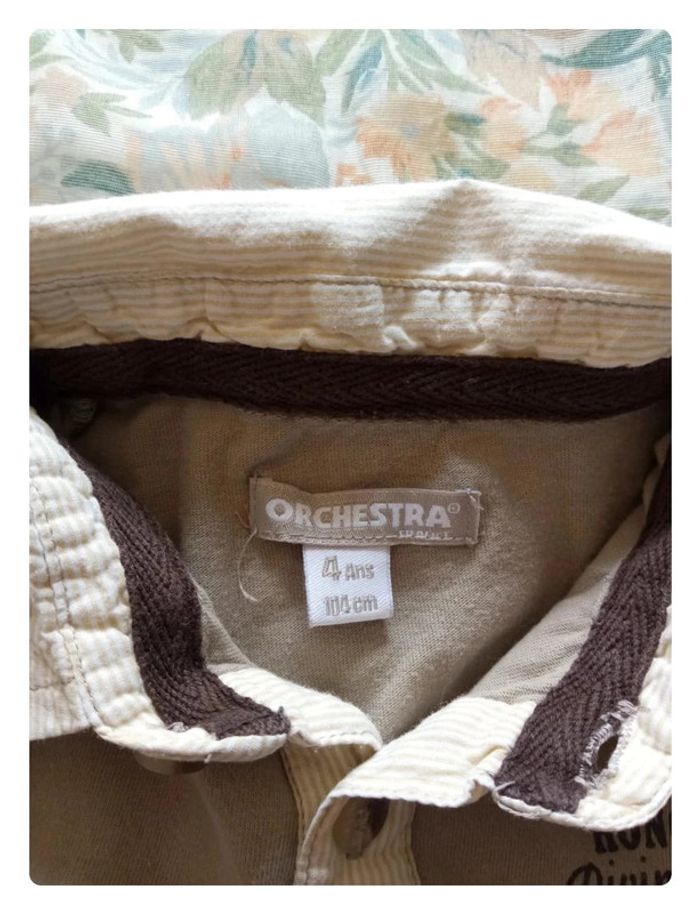 Polo crème et beige de chez Orchestra en 4 ans. Bien porté, le bas des manches n'est pas a l'abri de trace... Dessin en très bon état. #aurelie6251garcon4ans