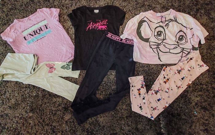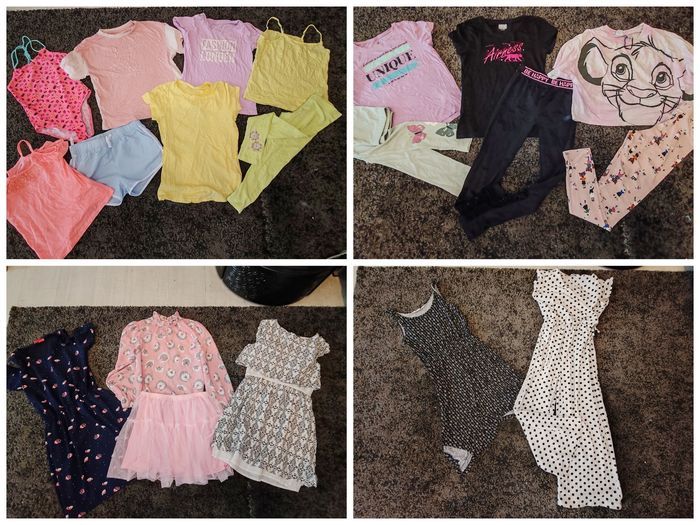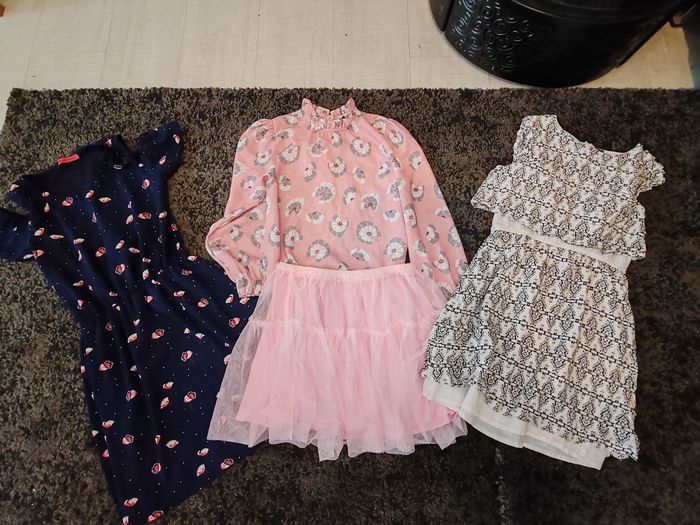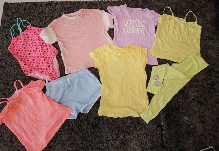Le lot comprends : - 2 robes dont une orchestra - 1 ensemble blouse orchestra et jupe tex neuve - 1 combi orchestra ( je donne elle présente des taches noires en pied) - 1 maillot de bain 1 pièce - 2 Legging long hetm - 1 Haut court simba Disney - 1 legging noir de sport - 1 t shirt manches courtes airness - 4 t shirt manches courtes - 1 top corail orchestra - 1 short léger bleu claire - 1 legging vert orchestra - un débardeur orchestra jaune Tbe pour le tout 39.90 euros Envoi en relais