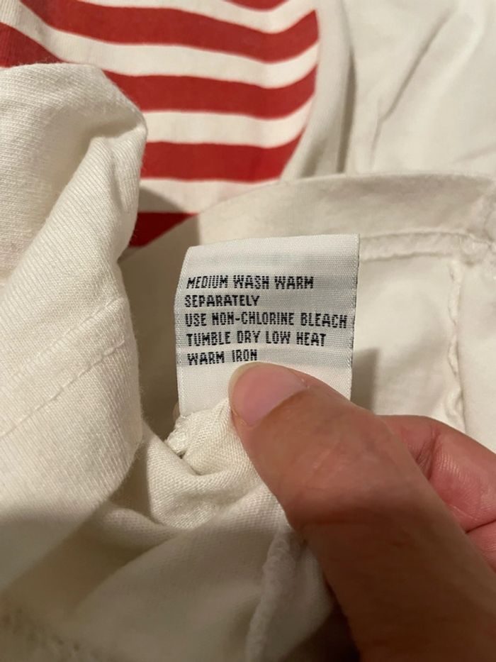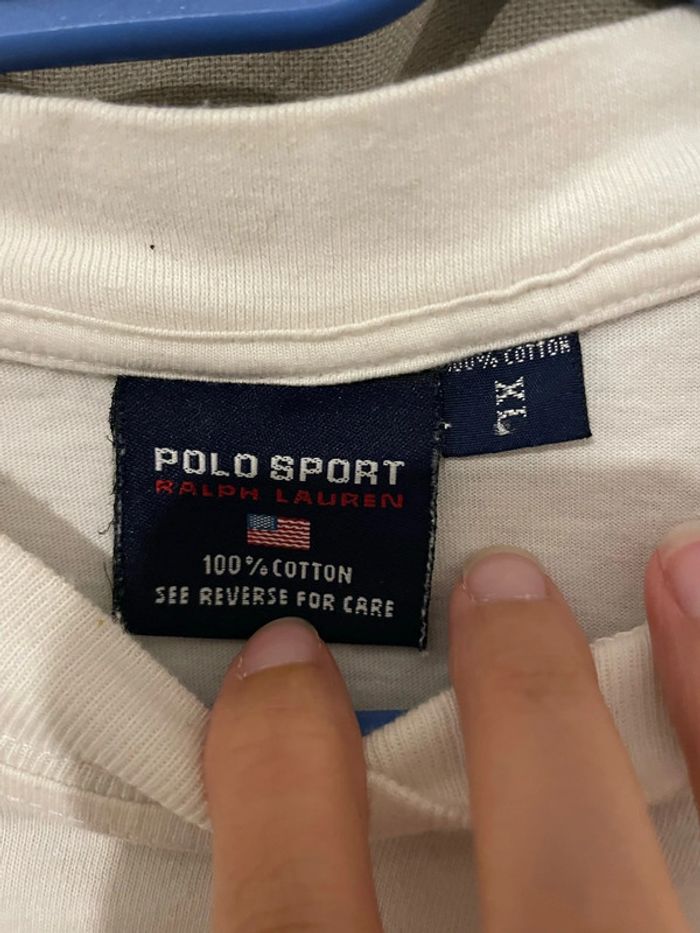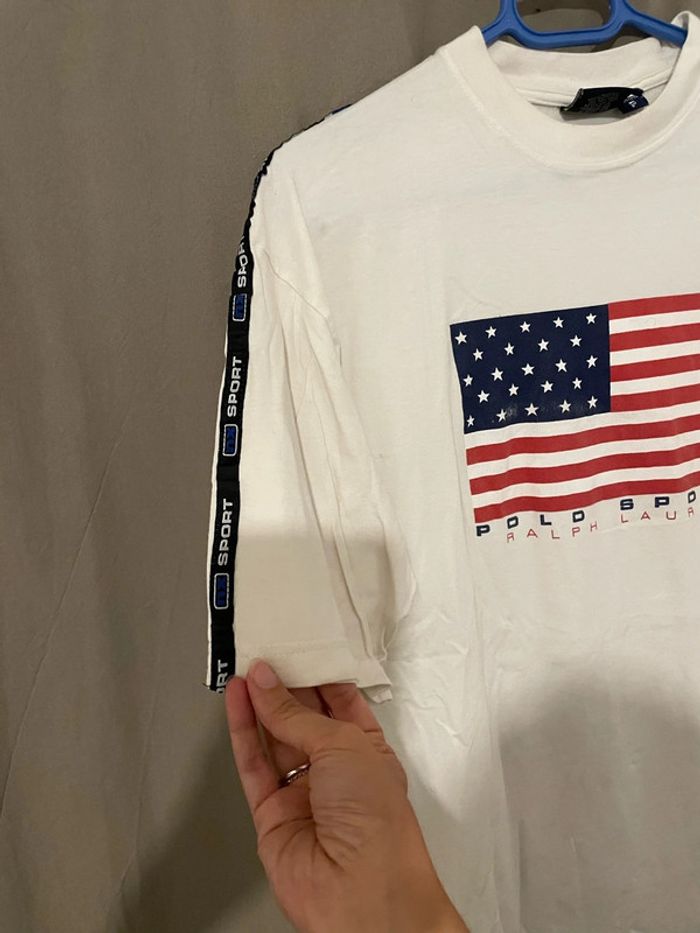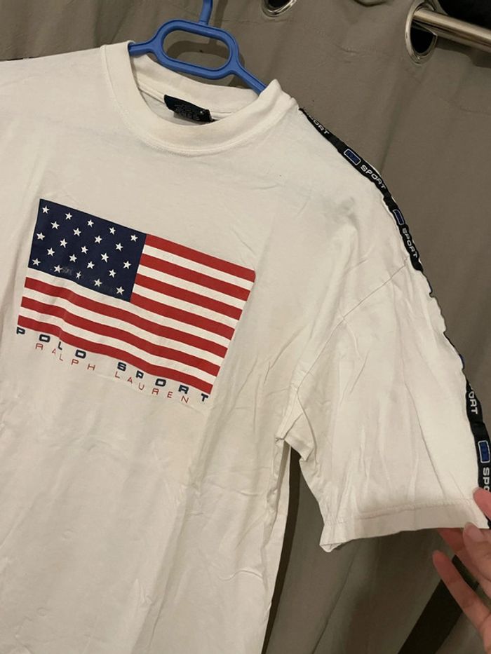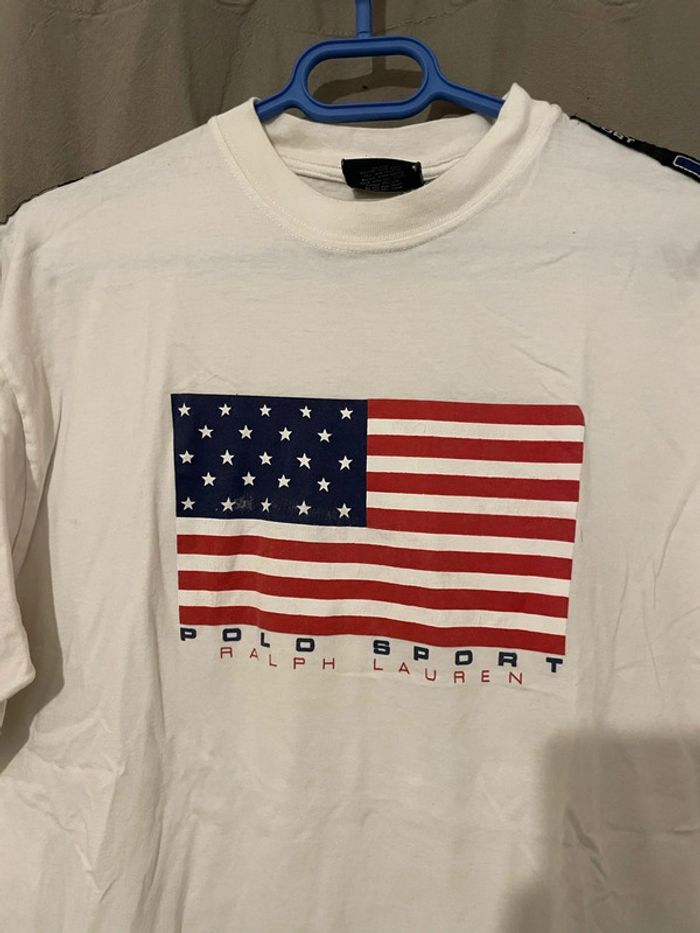 Bonjour je vends un T-shirt vintage à manches courtes blanc à motifs bleu marine et rouge Ralph Lauren taille XL Il est en très bon état très peu porté #tiatia_homme_taillexl