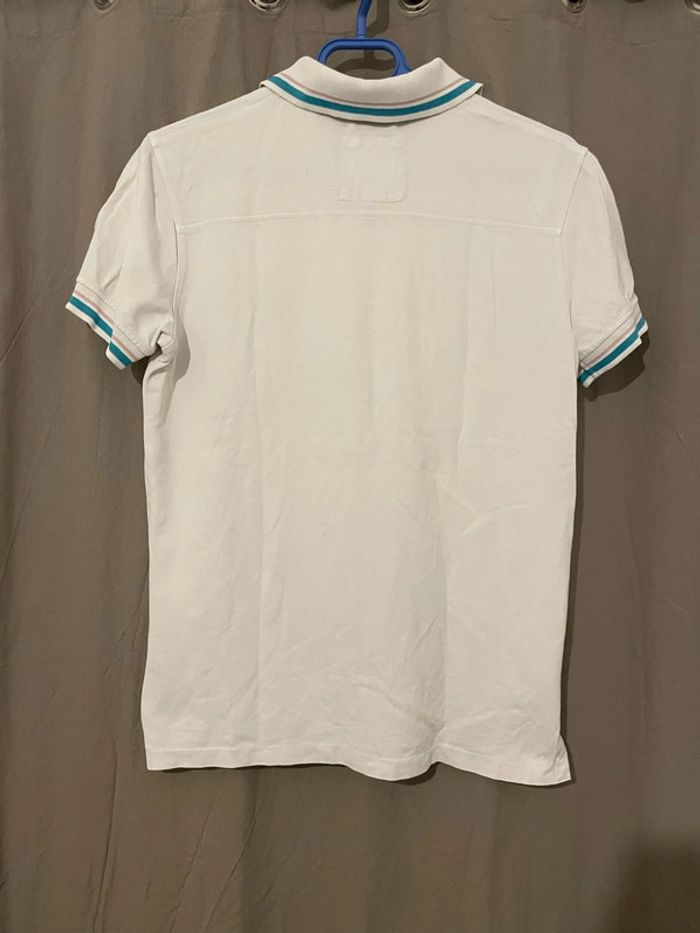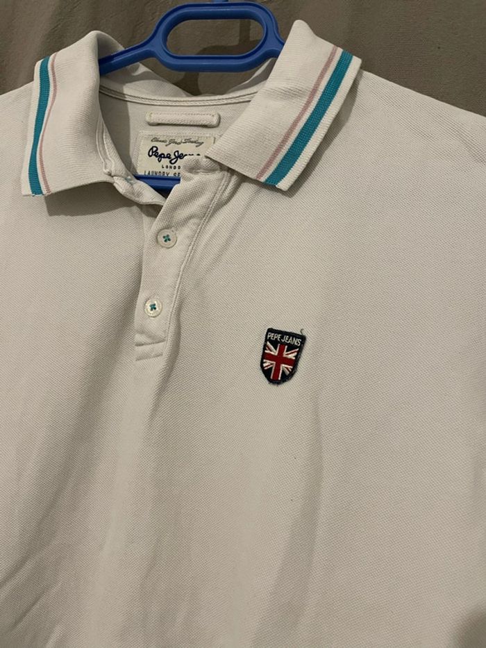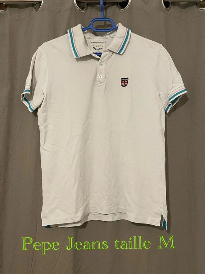 Bonjour je vends un Polo à manches courtes blanc rayures turquoise violet au col Pepe Jeans taille M Il est en très bon état #tiatia_homme_taillem